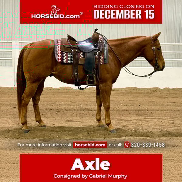 🎄𝐓𝐇𝐄 𝑯𝒐𝒍𝒊𝒅𝒂𝒚 𝐂𝐋𝐀𝐒𝐒𝐈𝐂🎄 Happening now thru MONDAY | DECEMBER 15th - Available EXCLUSIVELY on HorseBid's website! For more details and to register visit: www.Horsebid.com CONSIGNOR CONTACT: Gabriel Murphy 320-339-1458 LOCATION: Cannon falls, mn BREED: Qaurter horse REGISTERED: No COLOR: Sorrel HEIGHT: 15 AGE: 7 GENDER: Gelding Here’s a gem you won’t want to miss: a stunning sorrel gelding built to last. Standing at 15 hands high, he boasts broad hips and a sturdy build, thanks to his impressive horn. Axle is exceptionally well-bred, gentle, and safe for families. He has a comfortable neck rein, soft in the face and sides, and carries his head low on a loose rein. In the arena, Axle demonstrates a smooth lope, a powerful stop, and a graceful reverse. He effortlessly navigates the trail course, showcasing his charming personality. He’s adept at side passing and stepping around, making him a versatile and enjoyable companion. Axle can ride bareback, with or without a bridle, and is traffic-safe and sound. Axle has spent countless hours riding outside on the trails and the ranch, making him a seasoned trails professional. He’s been recognized and taken on overnight camping trips and ridden in the mountains. On the trails, he rides in the front or the back, maintaining a leisurely pace. He’s been on the road and is well-versed in handling traffic. Axle has also been used for pasture roping, cattle doctoring, and fence inspections. Axle is an absolute fit for any rider, capable of going in any direction. He’s a top-hand ranch horse, a trail deluxe with the off-road package, and a versatile rope horse. No matter where you take him, he’ll be a fun and reliable companion. Axle is easy to bathe and stands well for veterinary and farrier care. He’s up-to-date on vaccinations and deworming, and he loads in any size trailer and steps off easily. Location: Cannon Falls, MN