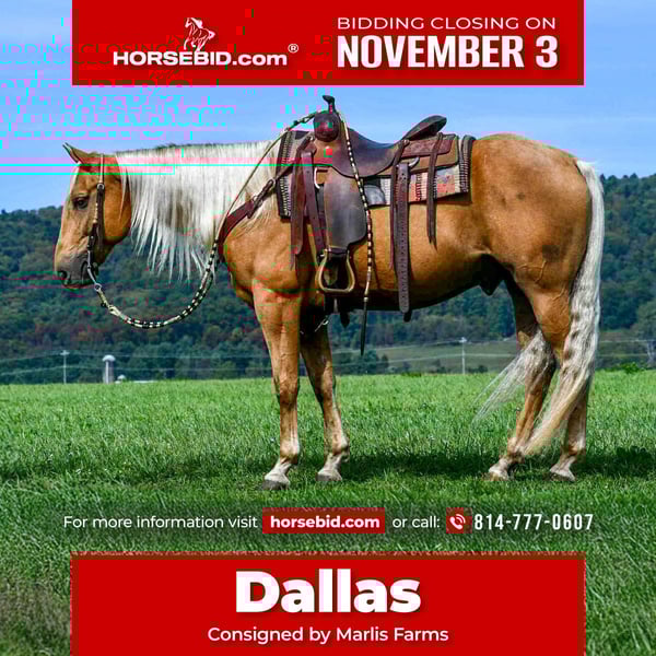 ⚜️𝐓𝐇𝐄 𝐅𝐀𝐋𝐋 𝐇𝐄𝐑𝐈𝐓𝐀𝐆𝐄 𝐂𝐋𝐀𝐒𝐒𝐈𝐂⚜️ Happening now thru MONDAY | NOVEMBER 3rd - Available EXCLUSIVELY on HorseBid's website! For more details and to register visit: www.Horsebid.com CONSIGNOR CONTACT: Marlis Farms 814-777-0607 LOCATION: Rebersburg, PA BREED: Quarter Horse REGISTERED: No REGISTERED NAME: Dallas COLOR: Palomino HEIGHT: 15.1 AGE: 7 GENDER: Gelding Dallas is a 7 year old gelding standing at 15.1 hands that’s well built and beautiful! He is very versatile, rides English and western and loves to go out on the trails! Dallas is safe, reliable and user-friendly! He has a very smooth, well balanced walk, trot and canter. He picks up both leads, he knows the word “woah” and has a good stop, back up, he neck reins, side passes and is very soft in the bridle! Dallas has no silly quirks, his gentle and forgiving personality makes him suitable for more inexperienced riders! On the trails is where Dallas really shines! He absolutely loves adventure. We have ridden him up in the mountains and down through town and he’s enjoyed every bit of it! Dallas has no spook and easily crosses over logs, bridges, creeks, railroad tracks etc. He is traffic safe and doesn’t mind the commotion of busy streets, pedestrians, dogs or bicycles! Dallas is all around a good boy and a reliable horse to have in the barn! He has good manners, he stands well for the vet, farrier and dentist! No bad habits or vices, he can be turned out in a mixed herd or be stalled. Dallas sells 100% sound and ready to move into his forever home! For more information or to schedule a visit to meet Dallas, call Mark @ 814-777-0607