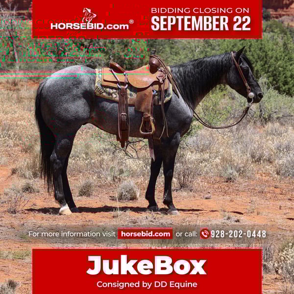 🍁𝒕𝒉𝒆 𝐅𝐀𝐋𝐋 𝑺𝒑𝒆𝒄𝒕𝒂𝒄𝒖𝒍𝒂𝒓🍁 Happening now thru MONDAY | SEPTEMBER 22nd - Available EXCLUSIVELY on HorseBid's website! For more details and to register visit: www.Horsebid.com CONSIGNOR CONTACT: DD Equine 928-202-0448 LOCATION: Camp Verde Arizona BREED: Aqha REGISTERED: No REGISTERED NAME: JukeBox COLOR: Blue roan HEIGHT: 15.1 AGE: 7 GENDER: Gelding If you're looking for a horse you will stick out in a crowd riding the horse in the barn with the most chrome. Then look no further, meet JukeBox he is a 7 year old 15.1 hand true Blue Roan gelding. Jukebox has been used for all aspects of western disciplines from play days to everyday ranch work. He spent the entire past spring working several different ranches for spring branding. He is rock footed and absolute blast to ride in the mountains. He will also cross water with no issues. Jukebox is also started in the team roping pen and has had live cattle roped. He would not take much to finishing him in the roping pen. He has a very soft and gentle eye to him and is very soft in the bridle. He collects and has a very fancy walk trot and lope. He will pick up both of his leads and has a great stop and backup. Jukebox has had all levels of riders on his back and is very forgiving to mistakes. He is a true saint when it comes to the farrier and will stand quiet all day long. If you're looking for a horse that is extremely diverse and will excel in anything you throw in front of him. Jukebox is going to be your kind of gelding. Jukebox sells with a lameness exam, as well as a Coggins and health. We can assist with shipping him anywhere in the US. He is located in Camp Verde AZ Please call or text for any additional questions 9282020448
