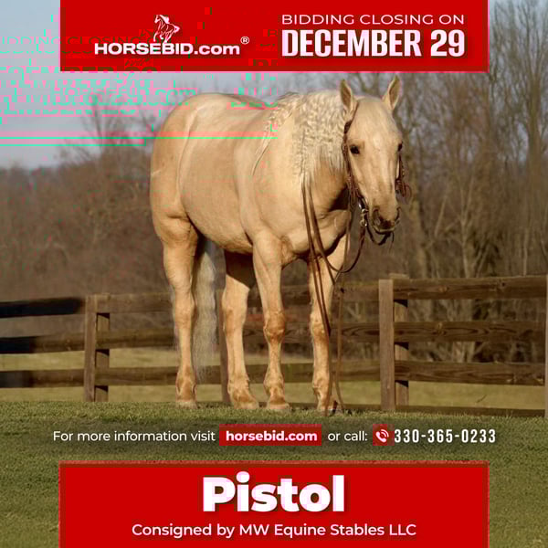 ⚜️ 𝓗𝓮𝓻𝓲𝓽𝓪𝓰𝓮 𝐖𝐢𝐧𝐭𝐞𝐫 𝓒𝓵𝓪𝓼𝓼𝓲𝓬⚜️ Happening now thru MONDAY | DECEMBER 29th - Available EXCLUSIVELY on HorseBid's website! For more details and to register visit: www.Horsebid.com CONSIGNOR CONTACT: MW Equine Stables LLC 330-365-0233 LOCATION: Fresno, OH BREED: Quarter Horse REGISTERED: No COLOR: Palomino HEIGHT: 15.2 AGE: 7 GENDER: Gelding 𝐈𝐟 𝐲𝐨𝐮’𝐯𝐞 𝐛𝐞𝐞𝐧 𝐬𝐞𝐚𝐫𝐜𝐡𝐢𝐧𝐠 𝐟𝐨𝐫 𝐚 𝐡𝐨𝐫𝐬𝐞 𝐰𝐡𝐨 𝐜𝐡𝐞𝐜𝐤𝐬 𝐞𝐯𝐞𝐫𝐲 𝐛𝐨𝐱—𝐯𝐞𝐫𝐬𝐚𝐭𝐢𝐥𝐞, 𝐫𝐞𝐥𝐢𝐚𝐛𝐥𝐞, 𝐥𝐞𝐯𝐞𝐥-𝐡𝐞𝐚𝐝𝐞𝐝, 𝐚𝐧𝐝 𝐬𝐰𝐞𝐞𝐭 𝐚𝐬 𝐩𝐢𝐞—Pistol is the one you’ve been waiting for. He is the kind of partner who gives you the freedom to go in any direction while giving you the peace of mind that he’ll take care of you along the way. A safe, steady, and adaptable partner, ready for any adventure. Pistol is a 7 year old Palomino grade Quarter Horse gelding standing 15.2 hands high. This gelding is beauty, brains, and talent wrapped into one perfectly sized package. He has the absolute best personality, this gelding wants to be your friend and be a part of the family. He rides western, trails, bridleless, bareback.. And is an absolute sweetheart. He is will cross all kinds of obstacles, creeks, bridges, logs, etc.. Pistol has 3 amazing gaits - walk, trot, and canter.. He has been on tons of public trail rides and moonlight rides.. Rides great with a group as well as alone.. He is also great on turnout with a herd.. He’s been thoughtfully started and given the kind of foundation that sets him up for success in absolutely any discipline. With his temperament and training, Pistol is an ideal match for an amateur seeking a trustworthy, sensible young horse to parter with and enjoy for many years to come. For more info contact Marcus@ 330-365-0233 Located in Fresno Ohio