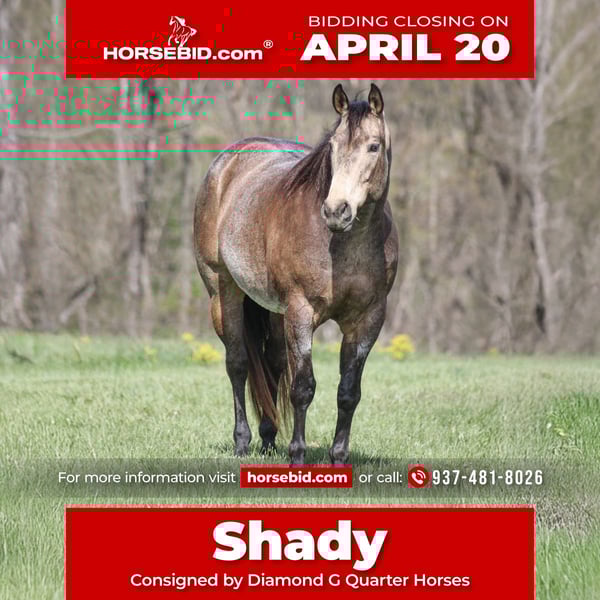 ⚜️𝐭𝐡𝐞 𝓔𝓵𝓲𝓽𝓮 𝐒𝐩𝐫𝐢𝐧𝐠 𝐂𝐥𝐚𝐬𝐬𝐢𝐜⚜️ Happening now thru MONDAY | APRIL 20th - Available EXCLUSIVELY on HorseBid's website! For more details and to register visit: www.Horsebid.com CONSIGNOR CONTACT: Diamond G Quarter Horses 937-481-8026 LOCATION: Mt Vernon, Kentucky BREED: Quarter Horse REGISTERED: Yes REGISTERED NAME: TD SHADY STORY COLOR: Buckskin roan HEIGHT: 15.2 AGE: 8 GENDER: Gelding When it comes to shady, he is anything but that. 8 years old, registered Quarter Horse, standing at 15.2 hands. A true buckskin roan with a kind demeanor and the foundation of a brick house. Don’t let his size fool you, if he could live in your pocket he would! Shady has worn many hats through his life. From ponying colts, catching wild cattle, working a feed lot, turning back for a cutting program to babysitting children and adults through the trails, shady has seen it all and has the mind to prove it. What’s the best thing about Shady……leave him off for six months, pull him out to ride and he will act like he’s been worked everyday for the last six months. He’s gentle to bathe, stands for the farrier, loads with ease, leads for children so small he can’t even see them. The praises for this horse are high and words can’t do him justice, come try him out and you’ll fall in love!