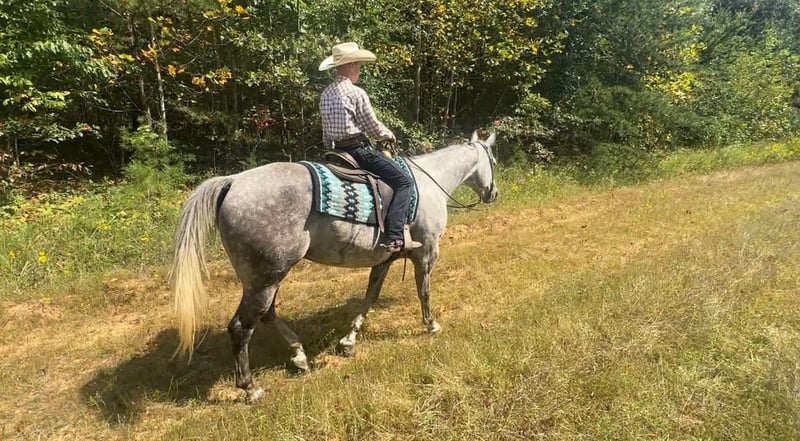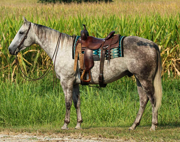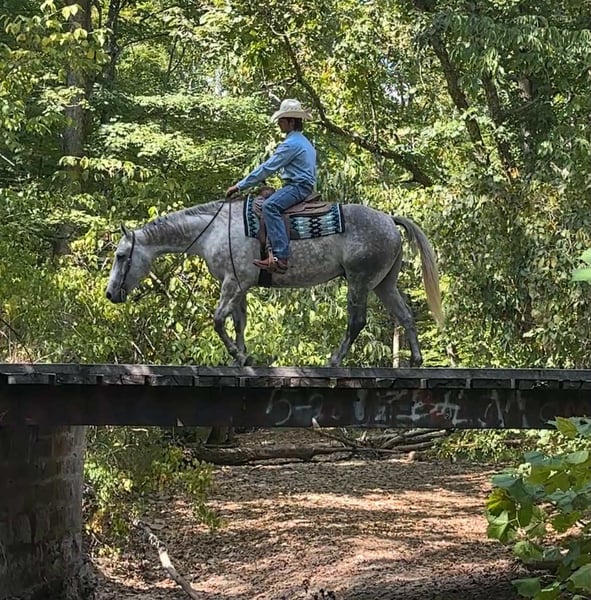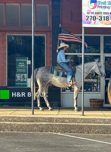 ONLINE AUCTION Place your bids at www.PlatinumEquineAuction.com Starting Bid $3500 Auction ends November 9th, 2025 Need a new saddle? Check out White Rock Saddles on our website or Facebook Waylon is a 7yr old grade quarter horse gelding standing at 15.3hh! He is a gorgeous dapple gray, with the sweetest personality! He is a dream to ride! He has the smoothest trot and canter! His walk, is easy and slow making him a great trail horse! He is very forgiving, and a great horse for all levels of riders! He is safe and dependable! Waylon moves nicely and listens to cues well! You can saddle him up and ride off or just hop on him bareback. He is as honest as the day is long and the same horse everytime you take him on a ride! We have taken Waylon to state parks on rides and overnight camping trips! He does great at new places and takes everything in stride! Waylon is great in all types of trail group settings, and will lead the pack or follow! He is remarkably surefooted, you can count on him to pay attention and navigate any terrain you put in front of him. He loves water and will cross creeks, steps over logs and doesn’t mind the steep hills! He doesn’t mind the traffic, heavy machinery and is used to being around dogs as well! Waylon has also turned back cattle, has been ridden all over the pastures checking yearlings and cow/calf pairs. He has been roping the sled and doing great. He is an all around sweet gelding and so fun to ride! Waylon also rides very well in the arena, he will pick up both leads, he stops and backs up! You can ride him on a lose rein and neck rein or he will direct rein as well! He is a very smart guy and adapts well to new riders! Waylon is one of the sweet and gentlest gelding you will meet! He is very affectionate and is the first to meet you at the gate, and will be a great asset to become a lifetime partner for the family! If you would like to schedule a time to come meet and ride Waylon, or have any other questions about Waylon feel free to reach out to Tasha with DNT Horses at 270-844-2400. We are located in Henderson KY and can assist with transportation arrangements. Don’t let this amazing gelding get away from you if you wanting something big, beautiful and dependable. ONLINE AUCTION Place your bids at www.PlatinumEquineAuction.com Starting Bid $3500 Auction ends November 9th, 2025 Need a new saddle? Check out White Rock Saddles on our website or Facebook