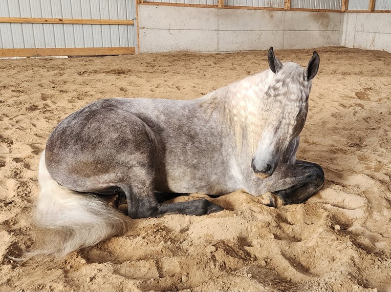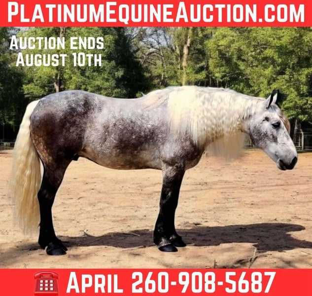 ONLINE AUCTION Place your bids at www.PlatinumEquineAuction.com Starting Bid $3500 Auction ends August 10th, 2025 Need a new saddle? Check out White Rock Saddles on our website or Facebook I’m privileged to offer you the opportunity to own this majestic, flashy gelding! Meet “Sterling”. Sterling is a 7 year old Quarter Horse-Percheron Cross Gelding, standing a stout 15.3 hands tall, weighing in around 1,300 pounds. Sterling exceeds all expectations in every direction. This honest gelding will take you in any direction, wherever you need to go. His phonomal disposition and excessive willingness to please makes him the perfect family horse. Sterling has had professional, extensive training and is truly push button. He is 100% desensitized with anything you could imagine, balls, tarps, whips, flags, farm equipment, obstacles, cows, dogs and semis. Sterling is 100% TSS. He has been ridden on main highways and through town with flags whipping and never misses a beat. Sterling is 100% neck reined as well as 100% leg pressure trained, either way you choose to ride, he’s always on point. He is a master on the trails as well as in the arena. He will stay steady and slow, or he will kick it up and move! Sterling loves water and is always confident in any situation you put him in on the trails. He crosses logs, over bridges, down the steepest hills, and up the roughest terrain with ease. You can ride Sterling bridleless, bareback, english (he loves to jump!), western, double, or hook him up to a carriage and take off! Sterling has exceptional transitions, with the smoothest trot and rocking chair lope! He stands great for the ferrier, and to be bathed. He hauls like a dream and will even load himself with no halter on. You can let this gelding sit for 6 months, pull him from the pasture, jump on and go, hes never fresh. He has no vices or bad habits. With the snap of a finger he will side pass for you to mount. He knows the word “Stay” and will only come to you once you snap your finger and tell him to “come”. Sterling sits and lays down on command for you to mount and dismount! Although it is never nessery, he will even lunge himself just for fun! He has been on countless over night camping trips, and will stay tied to a picket line all day and night with ease. He rides out alone or with large groups of people and strange horses. Sterling has no spook or buck and gets along great with other horses. He is started on cattle and gets down and gritty, he would enjoy the life on a ranch! You can throw a rope off him and he knows the drill. Sterling is no stranger to a hard days work, he will always put in 100%. Sterling is definitely a must to come check out! Please contact for more information or to set up a visit! I can arrange our own personal transportation to in sure Sterling gets to your facility safely. Located in Camden, MI. For more info contact April with Mid-West Performance Horses 260-908-5687. ONLINE AUCTION Place your bids at www.PlatinumEquineAuction.com Starting Bid $3500 Auction ends August 10th, 2025 Need a new saddle? Check out White Rock Saddles on our website or Facebook