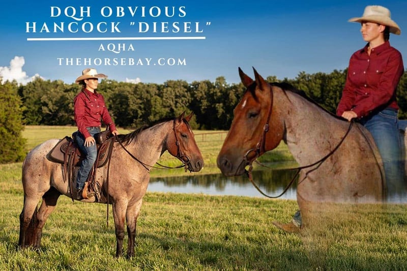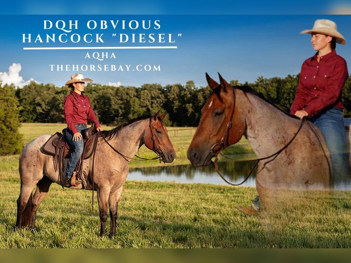 Meet Diesel – DQH Obvious Hancock Diesel, registered as DQH Obvious Hancock, is a flashy 7-year-old bay roan gelding standing a full 16 hands. Cowboy-colored and built to last, he’s tall, stout, and ready to go to work. Disposition Diesel is gentle, good-minded, and easy to get along with. His calm temperament makes him enjoyable for a wide range of riders. He’s the kind of horse that’s steady in new situations and patient when asked to stand tied at the trailer all day. Training & Experience He has a strong start in the arena and on the ranch. Diesel has been started on the head side, worked in breakaway, and proven himself at cattle sorts. Outside of the arena, he has logged countless trail miles through every kind of terrain. He’s also traffic safe, parade ready, and has even been exposed to trains. Whether you’re riding double, hauling to a show, or taking him on a week-long camping trip, Diesel takes it all in stride. Trail & Ranch Ready On the trail, Diesel is confident and sure-footed. He will cross bridges, logs, water, and embankments without hesitation. He hauls easily, settles in well when traveling, and is the type of horse you can count on to handle new environments with ease. Soundness & Care Diesel has big, solid feet and is currently shod all around. He stands well for the farrier and has been professionally maintained. He’s up to date on all veterinary care and vaccinations, with no maintenance required beyond his regular shoeing schedule. Full health and care records are available to interested buyers. Diesel is a solid, versatile gelding with the size, training, and experience to take in whatever direction you need.