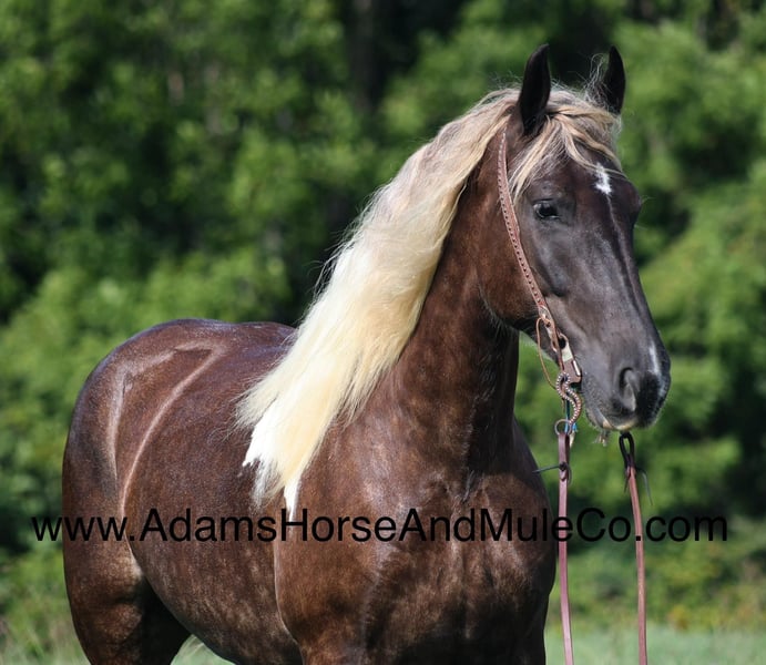 Go to www.AdamsHorseAndMuleCo.com for more pics and a video. AHAMC has been in the horse business and sold horses over the internet since 2005. We have a long track record of success with hundreds of happy customers. We work hard to match riders with the correct horses and specialize in beginner safe, family friendly horses that have been used and checked out by our family! This guy has the WOW factor!!! Kitkat is a stout built Gypsy Vanner Draftcross gelding standing 16.1h, he will weigh 1400lbs, he is 5 years old, and he is that super rare silver dapple paint color with big dapples on him. He is one cool looking guy! Not only does he look cool, he has all of the other boxes checked as well… he is Mr. Personality, as friendly as they come, loves attention and is very calm natured. KitKat is out of the same breeding program as several other top draftcross geldings that we have had over the last 4 years and every one of them has the right mind with the calm nature that makes them great family horses. KitKat has been in the program for the last two years and has completed the natural horsemanship training and does liberty work and he also knows some tricks, he will bow, and lay down. KitKat has been ridden by every member of our family all the way down to our 6 year old. He has been ridden down the highways and he is traffic safe as well. In addition to riding he also drives! KitKat is great on trails and he will cross creeks, ditches, logs and navigate rough rocky areas. He has a smooth jog, a VERY VERY nice easy to set lope, a good stop, turns a circle both ways and backs with ease! He has been exposed to all kinds of wildlife such as deer or turkey or other animals like cows or dogs and will go anywhere that he is asked too. He has been ridden many miles in the mountains and encountered every obstacle possible on the trail. He will go up or down even the steepest slopes, across deep creeks, over downed trees, and over all types of rough terrain while still being sure footed. KitKat is not cinchy, cold backed, does not crib or weave. KitKat is a once in a lifetime type of horse that will suit your family in every way!!! Feel free to call Eric 606-308-2461 with any questions.