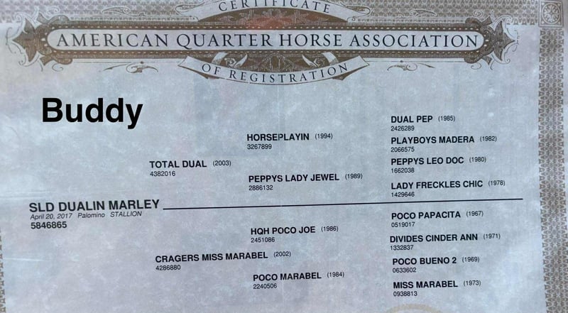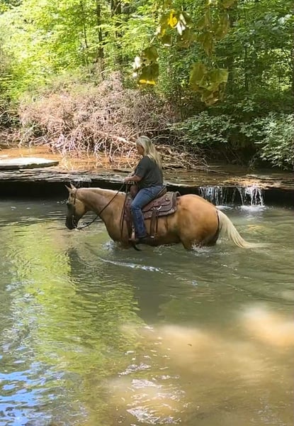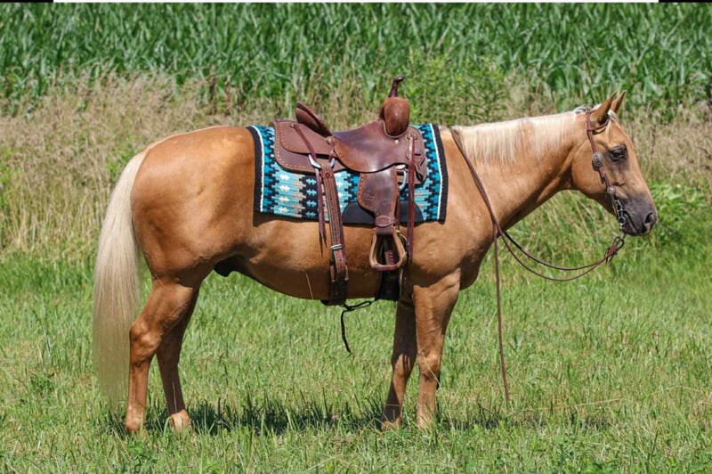 ONLINE AUCTION Place your bids at www.PlatinumEquineAuction.com Starting Bid $3500 Auction ends September 28th, 2025 Need a new saddle? Check out White Rock Saddles on our website or Facebook Meet ASLD DUALIN MARLEY who is a 2017 model, Reg AQHA Gelding also knows as Buddy. Buddy is a gorgeous golden palomino that is standing a stout built, 14.2 hands tall. He has a pure white mane and tail. We call him Buddy because he wants to be your buddy. He has a funny personality and wants all the attention. Buddy is very loving and easy to catch. He will actually catch you as he loves attention! Buddy is royally bred going back to the famous Frenchmans Guy on the top side and Rowdy Blue Man on the bottom! Buddy is out standing on the trails and has been trail ridden through many different types of terrain. He is sure footed and honest. Buddy will cross creeks, go through any body type of water, thick brush, logs, bridges, rough terrain, up and down cliffs with ease and has been through all the obstacles. He is a point and go type of horse. He has been rode on the road and is use to all kinds of traffic, heavy machinery, ATV’s and dog safe. You can ride Buddy out alone with ease or with other horses. Buddy has also been hooked up to a wagon single or double and will go all day. Buddy has also been a Jr rodeo horse doing all the events as well as a grand entry carrying the flag. You can use him on the ranch roping, checking and doctoring cattle. Buddy will stand still for you to get on him from the ground, a mounting block or whatever you find out on the trail. He stands to be groomed, fly spray, stands still to be saddled, bathes good, loads great and stands for the farrier. Buddy is the true definition of an all around horse. He is broke for any level rider. We invite anyone and everyone to come meet and ride Buddy at our barn in Henderson, KY. We are happy to assist with transportation arrangements. For any questions about Buddy please contact Tasha with DNT Horses 270-844-2400. ONLINE AUCTION Place your bids at www.PlatinumEquineAuction.com Starting Bid $3500 Auction ends September 28th, 2025 Need a new saddle? Check out White Rock Saddles on our website or Facebook