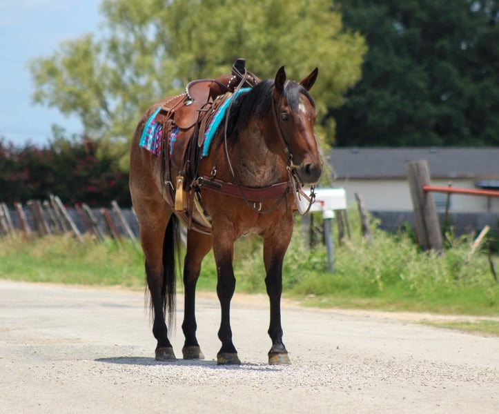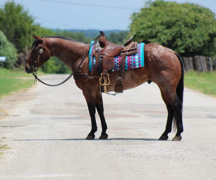 ONLINE AUCTION Place your bids at www.PlatinumEquineAuction.com Starting Bid $3500 Auction ends August 4th, 2024 Need a new saddle? Check out White Rock Saddles on our website or Facebook! Pablo is a stunning 7 year old bay roan gelding standing 14.3 hds tall and as wide as a mac truck ! He has an old soul demeanor to him and acts like a seasoned veteran wherever you take nothing bothers him and I mean nothing! He has been on several trail rides and hunting trips in the Rocky Mountains. He can go up and down any mountain and is sure footed . He always rides low headed and never raises his head above the saddle horn just like one should . He has been rode down the historic Forth Worth Stockyards and handled all the commotion, crowds of people , and traffic like a seasoned pro . He has zero spook to him and would ride to war if you asked him to. He is a blast to ride down the trail , he is confident and goes wherever you point him up and down hills, crosses water, bridges, logs and tarps with zero issues. He has seen many wildlife out on his adventures. In the arena he will walk , trot and lope circles with a great stop ! The great thing about him you don’t have to be a cowboy to ride as long as you can sit up there and hold the reins you can ride him wherever you want . From the trails to checking your herd of cattle he’s the one for the job . Pablo has a bright future of him and someone is going to enjoy him for many years to come . He is a barn favorite and I just know at his next home he’s gonna be the favorite also . He is the first one to meet you at the gate , he stands tied , easy to tack up and bridle , stands for the farrier, baths, loads and unloads like the perfect gentleman he is. Keep him in a stall or a pasture he doesn’t care. Contact us to come try him or we can set up a FaceTime also. If you need help with transport don’t hesitate to ask we have a list of reputable haulers that can get him safely to your doorstep world wide. Contact M $ Performance Horses Michelle 661-817-9120 Located in Stephenville, TX. ONLINE AUCTION Place your bids at www.PlatinumEquineAuction.com Starting Bid $3500 Auction ends August 4th, 2024 Need a new saddle? Check out White Rock Saddles on our website or Facebook!
