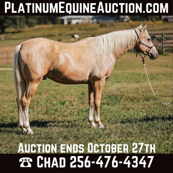 ONLINE AUCTION Place your bids at www.PlatinumEquineAuction.com Starting Bid $3500 Auction ends October 27th, 2024 Need a new saddle? Check out White Rock Saddles on our website or Facebook! Taz is a 7 year old gelding standing 15 hands tall. This gelding is a complete gentleman with tons of eye appeal. He spend his 3 and 4 year old years with an Amish family in Mississippi where they used him to go to town. The kids rode him to school. He has been trail ridden since then and really enjoys his job. He has a really nice short lope and is very easy to ride. If you are looking for your next eye catching trail horse, don’t miss him, he is 100 percent in every way. For more information contact Rocking L Livestock Chad at 256-476-4347. Located in Mt. Hope, AL. ONLINE AUCTION Place your bids at www.PlatinumEquineAuction.com Starting Bid $3500 Auction ends October 27th, 2024 Need a new saddle? Check out White Rock Saddles on our website or Facebook!