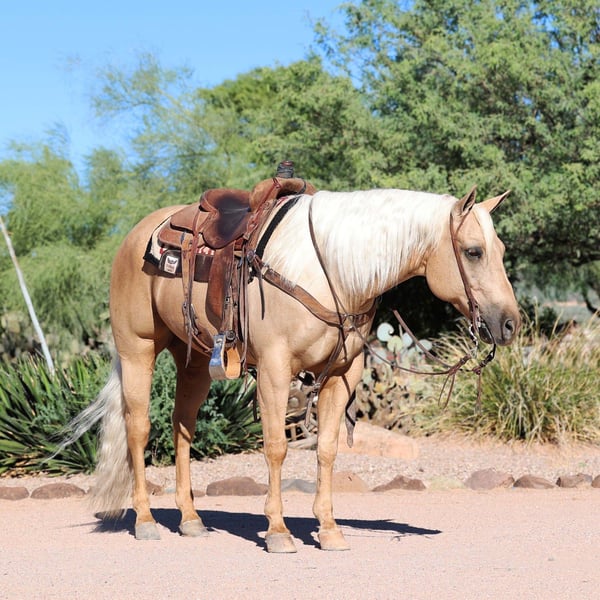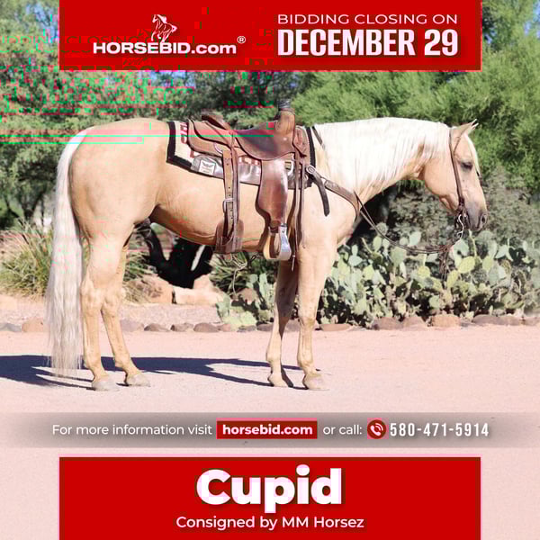 ⚜️ 𝓗𝓮𝓻𝓲𝓽𝓪𝓰𝓮 𝐖𝐢𝐧𝐭𝐞𝐫 𝓒𝓵𝓪𝓼𝓼𝓲𝓬⚜️ Happening now thru MONDAY | DECEMBER 29th - Available EXCLUSIVELY on HorseBid's website! For more details and to register visit: www.Horsebid.com CONSIGNOR CONTACT: MM Horses 580-471-5914 LOCATION: Cave Creek, AZ BREED: Aqha REGISTERED: Yes REGISTERED NAME: Whizkeymakesmelena COLOR: Palomino HEIGHT: 15 AGE: 8 GENDER: Gelding Cupid is a kind and gentle palomino gelding with all the right things. He is 15 hands tall with good foot and bone. He’s by the great Whizkey and Diamonds and has a lot of his sires great qualities. Whizkey began his career in the reining and does every maneuver with ease. He turns as slow as you want or as fast as you want. He circles great and is very good leaded and is also the easiest horse to change leads on that I’ve ever ridden. He fits any level rider in this aspect as he is easy to maneuver and you don’t have to know a bunch of specific buttons to get what you want.Not only is he great in the reining but he is a very good in the roping pen whether heading or heeling. He has been hauled to jackpots in multiple states with various setups and not made a bobble. He scores great has a good move, is stout to the horn in the heading and is also very easy to ride in the heeling.He is also eligible for the $100,000 at the Riata Buckle Roping this year in Guthrie OK. He has been ridden outside extensively and is always calm whether you’re riding the roughest terrain or down the road. Best of all he is always kind and gentle no matter how long he’s been off. Watch his video call with any questions, or come try him for yourself. Current x-rays available