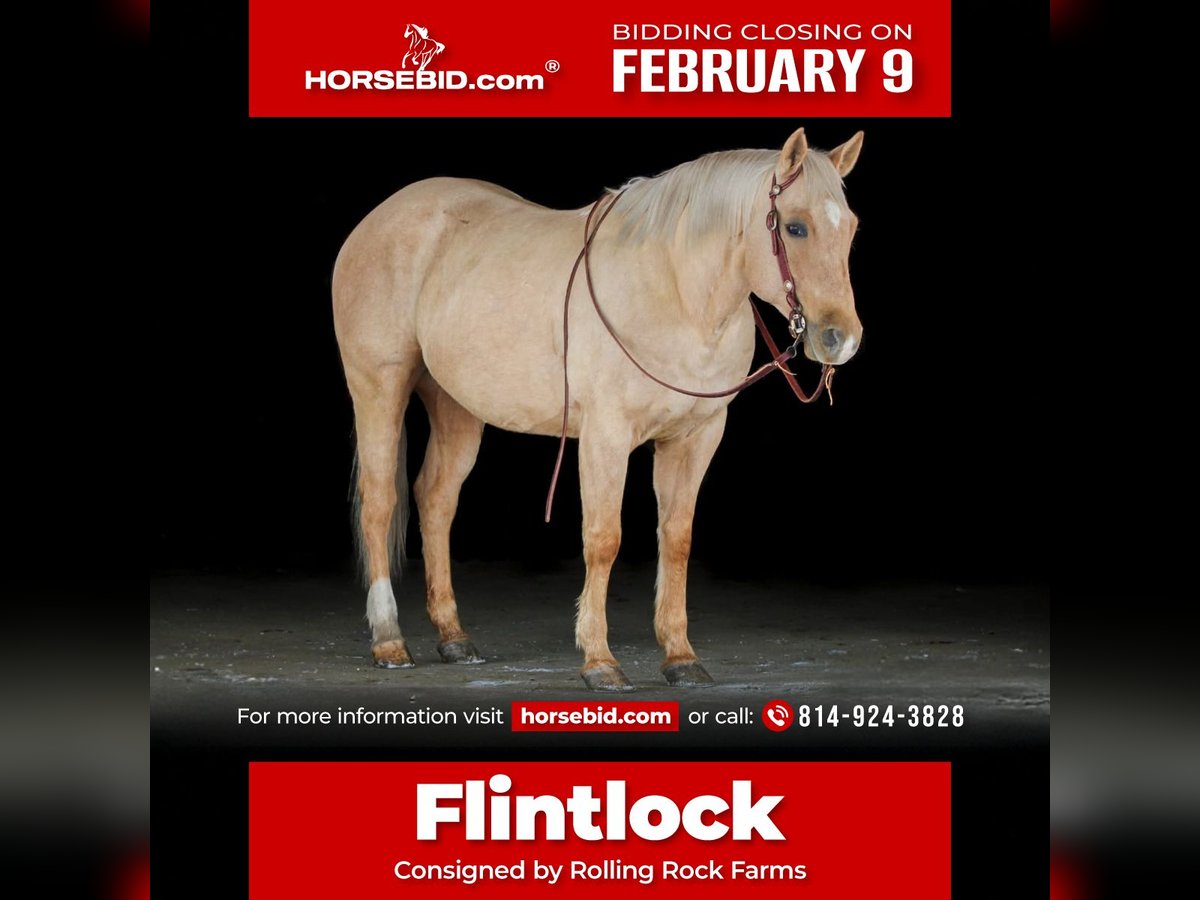 ❤️🔥𝑩𝒆 𝑴𝒊𝒏𝒆 𝐒𝐄𝐋𝐄𝐂𝐓❤️🔥 Happening now thru MONDAY | FEBRUARY 9th - Available EXCLUSIVELY on HorseBid's website! For more details and to register visit: www.Horsebid.com CONSIGNOR CONTACT: Rolling Rock Farms 814 924 3828 LOCATION: Miola, PA BREED: Quarter horse REGISTERED: No REGISTERED NAME: Flintlock COLOR: Palomino HEIGHT: 15 AGE: 9 GENDER: Gelding Flintlock is a very attractive 9 year old, 15 hand palomino gelding with a solid foundation and a correct way of going. He is a pleasure to ride in the arena and has been ridden correctly. He neck reins well, stands quietly to mount, and is responsive to leg and seat cues. He will trot along relaxed on a loose rein and will also pick up a headset when asked. His lope is smooth and balanced with nice, even circles, and he consistently picks up both leads. In the arena, Flintlock maintains a steady rhythm and understands his job. He moves willingly off your leg, stays soft through his body, and is uncomplicated to ride. He is comfortable working in consistent contact or on a draped rein and remains focused throughout his ride. Flintlock is also an enjoyable trail horse. He handles riding outside the arena well, goes willingly down the trail, and is confident riding out alone or with other horses. He crosses new terrain without issue, is not bothered by unfamiliar sights, and stays willing and steady in new environments. He will carry a flag, drag a sled, and is comfortable with a tarp being rubbed all over him, making him a reliable partner both in and out of the arena. On the ground, Flintlock has excellent manners. He stands quietly to be tacked, blanketed, and brushed, is calm and patient in cross ties, and leads well. He is easy to handle and respectful. He does well living either stalled or turned out and adjusts easily to different routines. Flintlock sells with a current negative Coggins and a current rabies vaccination. He is a good looking, well broke gelding that would make a great all around riding horse for someone looking to enjoy both arena work and trail riding. If you would like to check out Flintlock or have any questions please feel free to contact Ethan at (814) 924-3828