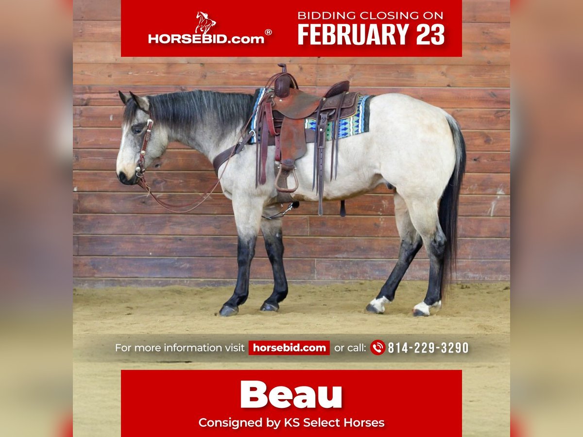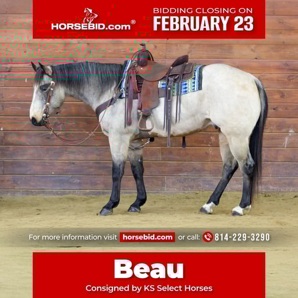 💎 𝐓𝐇𝐄 𝓓𝓲𝓪𝓶𝓸𝓷𝓭 𝐒𝐇𝐎𝐖𝐂𝐀𝐒𝐄 💎 Happening now thru MONDAY | FEBRUARY 23rd - Available EXCLUSIVELY on HorseBid's website! For more details and to register visit: www.Horsebid.com CONSIGNOR CONTACT: KS Select Horses 814-229-3290 LOCATION: Clarion, PA BREED: QH REGISTERED: No REGISTERED NAME: Beau COLOR: Buckskin Roan HEIGHT: 15 AGE: 9 GENDER: Gelding Beau is a 9 Year Old Super Cool Colored Buckskin Roan Quarter Horse Gelding. Standing 15 hands tall and super stocky built. Wow Check Him Out! Super Good Looking and Super Quiet and Gentle for the Whole Family To Ride! Beau is the Whole Package! Very Well Broke To Ride and Very Safe. He is a great trail horse. Been trail ridden many of miles and is very sure footed in the rough terrain on the trails. Trail ride him out alone or with other horses. Beaus is also capable of doing any job you ask him to do on the ranch also. Very good when it comes to working with cattle. He rides nicely in the arena and has a nice walk, trot and canter. Lopes nice circles hitting his correct lead each way. Beau will be super safe and super reliable and dependable each and every time you saddle him up to go ride. He will stay good broke with time off. You do not need to be a cowboy or cowgirl to ride him he is very quiet and gentle and beginner friendly. You will love how soft and easy his one hand neck rein is. Beaus is the whole complete package of good looks, brains and training! Dont miss out on Beau . We can help arrange delivery anywhere in the United States. Feel free to Call or Text Kris at 814-229-3290 . Thank You and God Bless