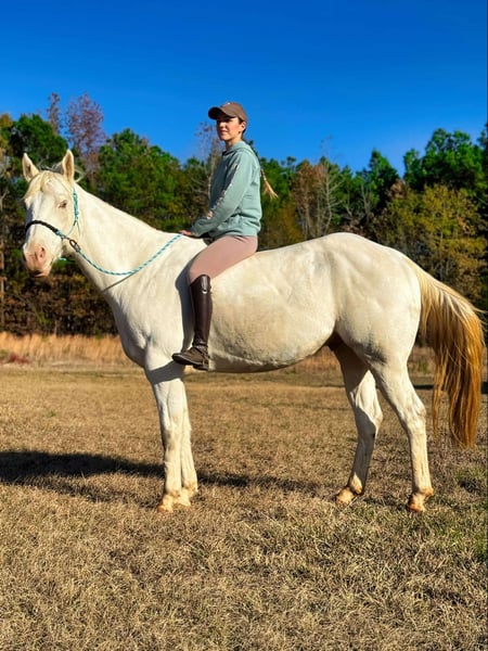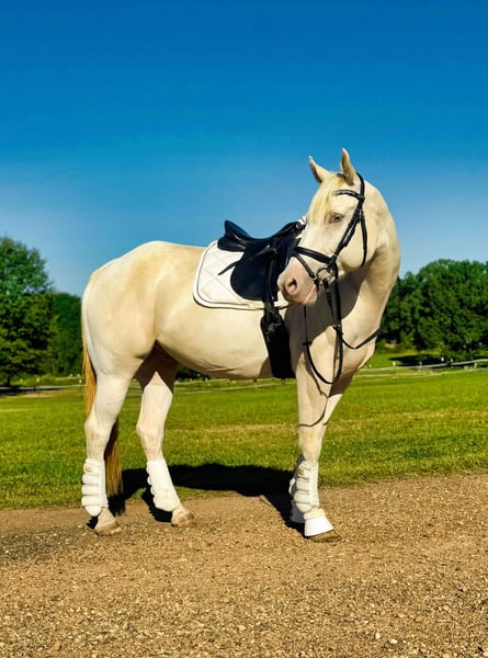 ONLINE AUCTION Place your bids at www.PlatinumEquineAuction.com Starting Bid $3500 Auction ends January 5th, 2024 Need a new saddle? Check out White Rock Saddles on our website or Facebook! Meet Champs Laced Apollo (“Apollo”) – a stunning 15.3-hand, 2017 Model, registered American Paint Horse Association (APHA) gelding with a unique champagne tobiano coat that gleams like liquid gold in the sunlight. His fairytale look is matched by a calm, steady personality and a friendly, reliable disposition. Apollo is as friendly as he is dependable. Calm and confident, he greets his handler every morning and is ready to bond with his next rider. He’s wonderful with children, beginner riders, and even those new to horses, adapting smoothly to their level. Apollo is great with other horses and doesn’t spook, making him a fantastic companion on the trail or around the barn. Apollo has been trained primarily in western riding but has recently taken on English riding with ease. He’s the ideal trail horse – safe, sure-footed, and unfazed by traffic or new environments. He’s also comfortable bareback or ridden with just a halter and lead rope, showing his adaptability and trustworthiness. Though beginner-friendly, Apollo also has potential for more advanced riders to bring him to higher levels. Apollo is in top health, up-to-date on vaccinations, worming, and farrier care. He’s easy to handle for grooming, saddling, and loading onto a trailer, making him low- maintenance and stress-free. Apollo would thrive in a family setting or with a beginner looking for a safe, gentle companion. He also has plenty to offer for advanced riders who want a beautiful, loyal horse to enjoy on trails or in training. This is a rare opportunity to own a horse as stunning and versatile as Apollo – the perfect blend of beauty, personality, and reliability. Contact Julia Gonzales 430-318-8474 Located in Texarkana, TX if you’d like to come meet Apollo and see if he’s the horse you’ve been dreaming of! ONLINE AUCTION Place your bids at www.PlatinumEquineAuction.com Starting Bid $3500 Auction ends January 5th, 2024 Need a new saddle? Check out White Rock Saddles on our website or Facebook!