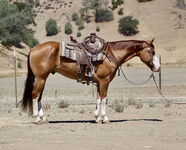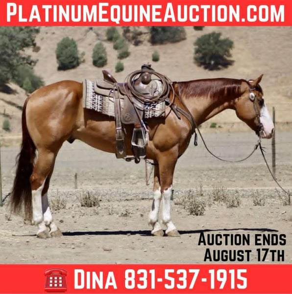 ONLINE AUCTION Place your bids at www.PlatinumEquineAuction.com Starting Bid $3500 Auction ends August 17th, 2025 Need a new saddle? Check out White Rock Saddles on our website or Facebook 6 Shooter – Where Steady Meets Stunning Looking for the kind of horse you can saddle with confidence, ride with a smile, and trust with your whole heart? Meet 6 Shooter—an 8-year-old, 15.1-hand dun paint gelding with four flashy white socks, tiger-striped legs, and enough charm to win over a crowd. This guy is the full package: smooth, steady, and packed with personality. He’s your go-with-the-flow, meet-you-at-the-gate, follow-you-like-a-dog kind of partner—the one that makes every ride feel effortless and every day a little brighter. Whether you’re cruising trails, pushing cows, or moseying down the road, 6 Shooter is your rock. He’s safe for all levels—from brand-new beginners to seasoned hands. On the trail? He’s a total pro. Crosses water like a duck, picks his way through rocks like a mountain goat, and navigates logs, brush, and narrow trails with total confidence. Throw him tarps, flags, tires, pool noodles—you name it—he’s seen it and shrugged it off. Chaos in town? No problem. He’s been around cars, semis, crowds, and sirens without batting an eye. In the arena? Smooth and classy. He walks, trots, and lopes on a loose rein, stops with ease, and backs soft and straight. He’s handy enough to get a job done, but gentle enough to pack your grandma on a Sunday ride. Cattle work? Check. Parades? Yep. He’s as versatile as he is handsome. He clips, ties, hauls, bathes, and stands for the farrier like a total gentleman. He stalls well, gets along with pasture buddies, and genuinely enjoys being around people. If you’re after a kind, trustworthy, do-it-all gelding with personality, presence, and a big ol’ heart—6 Shooter is your guy. Located in Paicines, CA 📞 Call Dina at Longhorn Ranch: 831-537-1915 to come meet this one-of-a-kind gelding. ONLINE AUCTION Place your bids at www.PlatinumEquineAuction.com Starting Bid $3500 Auction ends August 17th, 2025 Need a new saddle? Check out White Rock Saddles on our website or Facebook