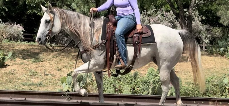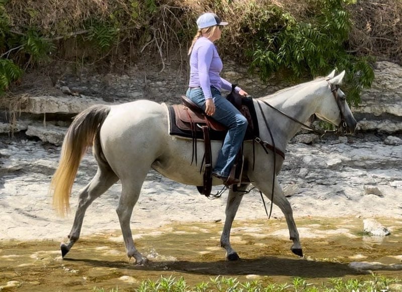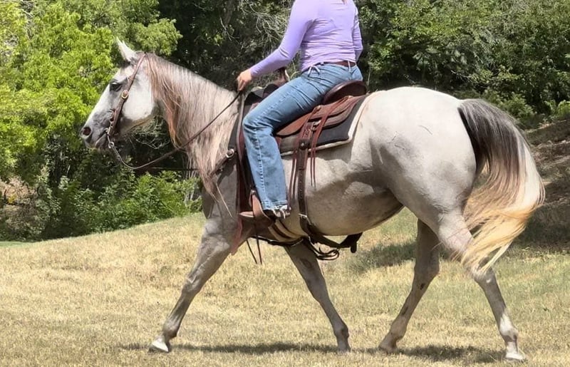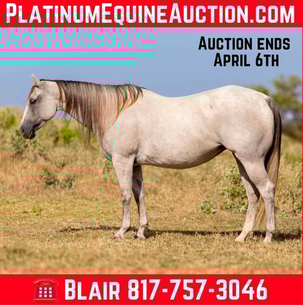 ONLINE AUCTION Place your bids at www.PlatinumEquineAuction.com Starting Bid $3500 Auction ends April 6th, 2025 Need a new saddle? Check out White Rock Saddles on our website or Facebook! Abby is a 9 yr old 14.2H, gorgeous, stout gray QH mare. She is a laid back trail rider’s dream! If you’re looking for one that’s more whoa than go, and extremely gentle natured, don’t miss this girl! Abby has been used as a family trail horse, where mainly the 11 yr old novice rider used her. She’s been rode in town and on trails primarily. She is not spooky in the slightest and is very laid back. She is one of those horses you can haul alone without her going crazy in the trailer or while tied looking for a friend. She stands solid footed wherever you tie her and bathes like a statue. She would be the perfect first horse for the little girl who wanted to crawl all over/under her, braid her hair and call her sprinkles. She’ll stand all day without a fuss and is absolute safe safe safe on the ground to be around the littles. Abby is a brick house and she’ll be able to handle most any size rider! Under saddle, she is very much a more whoa than go kind of gal. While you can absolutely get her to switch gaits, she won’t be one that trots/runs off with you ever! She stands solid as a rock to mount and NEVER will take a step until asked. She goes through water, over railroads and by cars without an issues. In the car world, she’s your Honda Civic, trusty and reliable but not going to win the Daytona 500. Abby is absolutely gentle all the way around and if you can walk a friendly dog, you’ll absolutely be comfortable with this mare. She’s also a comfortable horse to ride at all gaits. She’s best at direct reining but definitely will neck rein with leg pressure. Abby always stops exactly when you ask her to no matter how fast you’re going. She has one of the best, most laid back, gelding like personalities we’ve ever seen with a mare. She gets along with all other horses well and is a zero drama mare. She would excel as a trail horse, lesson horse for baby beginners, first kid horse, or first horse for a timid rider/horseman. She’s an incredibly easy keeper and stays fat on air. Abby is UTD on teeth and feed and is ready to go be her new person’s giant, respectful, quiet, easy going, melodramatic partner! Go to her website page northtexashorsecompany.com/abby for more pictures and footage! Please call Blair with North Texas Horse Company for more info at 817-757-3046. We are located in Weatherford, TX and can help arrange affordable shipping to anyone!! ONLINE AUCTION Place your bids at www.PlatinumEquineAuction.com Starting Bid $3500 Auction ends April 6th, 2025 Need a new saddle? Check out White Rock Saddles on our website or Facebook!
