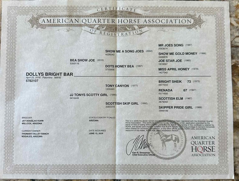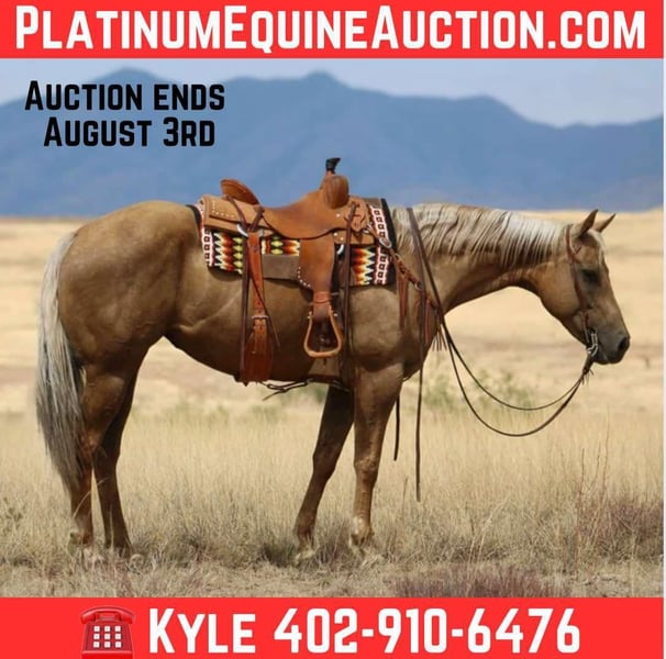 ONLINE AUCTION Place your bids at www.PlatinumEquineAuction.com Starting Bid $3500 Auction ends August 3rd, 2025 Need a new saddle? Check out White Rock Saddles on our website or Facebook Dollys Bright Bar aka Holly is a beautiful palomino mare, registered AQHA, 2016 model that is standing 15.1hh. She is gentle and reliable. She is perfect for Trail Riding, Ranch Work, or Beginners and is a horse that will take care of her rider. Holly is a kind and trustworthy mare who’s proven herself time and time again. She’s not fancy broke, but she is SAFE. She is great on trails and through the mountains. She has been through town with no issues, even with time off, she saddles up and rides right off without a fuss. She has experience moving cattle. She is beginner-friendly — kids have ridden her, she’s been used for lessons, and she’s taken care of riders with all levels of experience. She can be turned out in a big pasture and will be easy to catch — she’ll come right up to you like a puppy as she has a friendly personality and loves people! If you’re looking for a no-drama, easy-going mare that’s been there and done that, Holly is your girl. She is located in Nogales, AZ. Contact Kyle with Thunder Valley Ranch 402-910-6476 with any questions. Shipping is available anywhere in the US. ONLINE AUCTION Place your bids at www.PlatinumEquineAuction.com Starting Bid $3500 Auction ends August 3rd, 2025 Need a new saddle? Check out White Rock Saddles on our website or Facebook