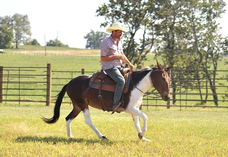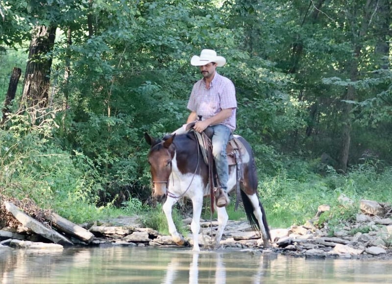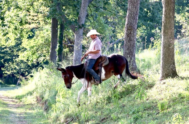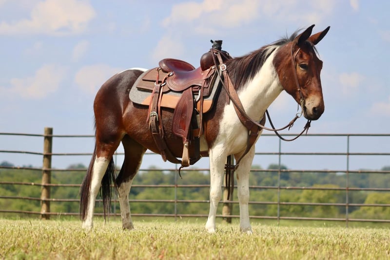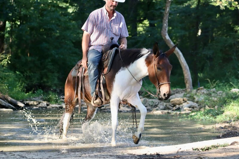 ONLINE AUCTION Place your bids at www.PlatinumEquineAuction.com Starting Bid $3500 Auction ends September 15th, 2024 Need a new saddle? Check out White Rock Saddles on our website or Facebook! Vegas is an 8 year old, 14.1 hand hand Molly mule. Her unique bay and white color is sure to be the talk of the town, and there won’t be another one like her out and about! We have had all levels of riders on Vegas. She rides the best on a full drape with a nice, level head. She prefers to walk and jog, but does lope happily across the pastures and fields. Vegas does all natural obstacles on the trails. She loves the water, and goes nicely down steep banks and hills. She walks over logs. She rides out alone or with the group. Vegas rides quietly with an experienced rider and takes care of them on the trails. We have taken her downtown to ride and she does well with the hustle and bustle of the city. She is a great ranch mule. She’s comfortable around cattle riding through the herd checking them daily. She will sort pairs, load trucks, and rope/doctor cattle. When it comes to work and riding, there isn’t much she can’t do. Vegas is good to take on camping tie out to the high line. Her good looks and thick hair are not what you see on mules often, but Vegas has it! For more information, please call Sammi Waugh 704-798-5497 Located in Brooksville, KY. ONLINE AUCTION Place your bids at www.PlatinumEquineAuction.com Starting Bid $3500 Auction ends September 15th, 2024 Need a new saddle? Check out White Rock Saddles on our website or Facebook!