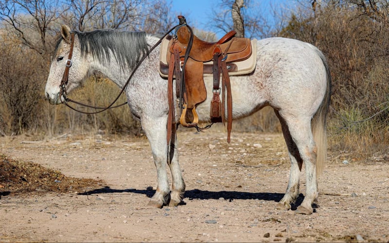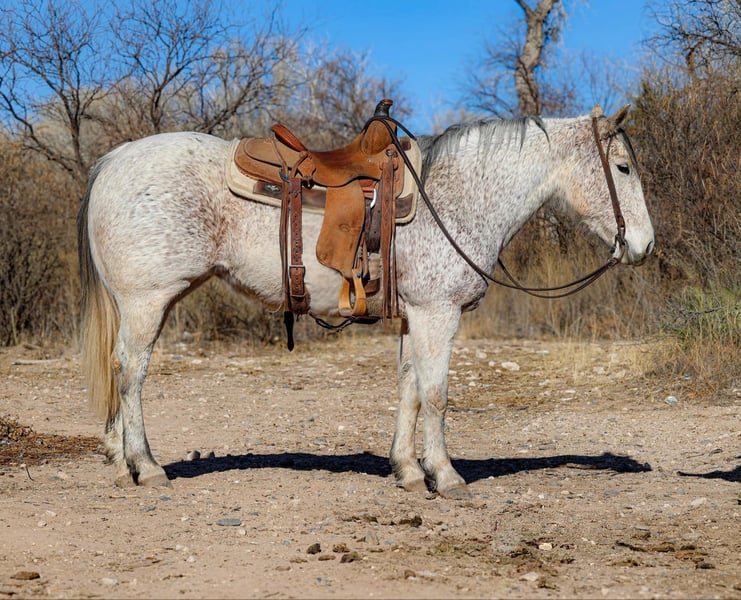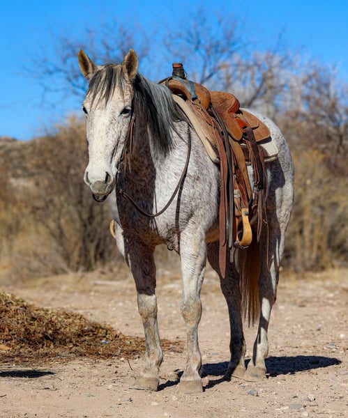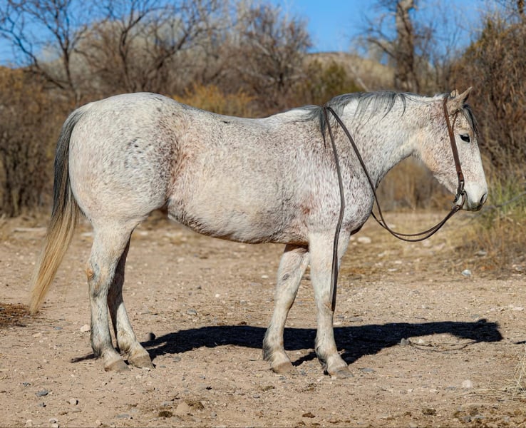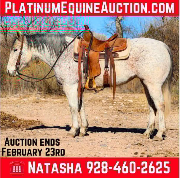 ONLINE AUCTION Place your bids at www.PlatinumEquineAuction.com Starting Bid $3500 Auction ends February 23rd, 2025 Need a new saddle? Check out White Rock Saddles on our website or Facebook! Gemma is a 10 year old grade mare standing 14.2hh. If you’re looking for an absolute sweetheart of an equine partner then Gemma is your gal! This kind, gentle, good minded mare can go absolutely any direction you’d like her to. She’s been a ranch horse her whole life making her well rounded and ready for anything you throw her way! Ease on through the brush, pound through rough rocky terrain, cross flowing rivers and fallen trees, you name it and this gal will take you through it surefooted as can be. Gemma has always been willing to go to work and is an absolute blast to ride outside, ready to take you on your next adventure!! Not only is this gorgeous mare a dream to ride on the trail, she’s just as fun in the arena! Gemma will walk, trot, and lope both ways with ease! Gemma is good to catch, groom, saddle, bridle, bathe, and load! Will come with a clean coggins and health!! Transport can easily be arranged anywhere in the US!!! Located in Camp Verde, AZ Contact D/C Equine Services Dallas 804-822-2233 or Natasha 928-460-2625. ONLINE AUCTION Place your bids at www.PlatinumEquineAuction.com Starting Bid $3500 Auction ends February 23rd, 2025 Need a new saddle? Check out White Rock Saddles on our website or Facebook!