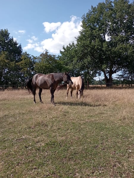 En raison de changements personnels, je suis à la recherche de nouvelles personnes pour ma magnifique jument Quarter Horse presque âgée de 11 ans, "Ellie MIJ Steeldust", de couleur spéciale "grulla". Elle a été monté en loisir en style western et a été régulièrement sautée par ma fille. Ellie est régulièrement sortie en balade seule ou en groupe. Elle marche également en main en toute sécurité. Ellie est très sûre d’elle sur ses pas et prend beaucoup de plaisir à faire des exercices de trail et en terrain varié. Elle se laisse facilement charger dans le van et ne montre aucune difficulté lors des visites chez le maréchal-ferrant, le vétérinaire, le dentiste ou l’ostéopathe. Au début, Ellie a besoin d’un peu de temps pour s’adapter à de nouvelles situations et à de nouvelles personnes. Elle est incroyablement câline et très amicale avec les humains. Elle vit dans une ferme très animée et connaît les enfants (sur balançoires, vélos et trottinettes), les chiens, les chargeurs sur chenilles, les fêtes de club avec déguisements, etc. Étant très attachée à une personne, elle ne convient pas pour une pension école d’équitation. Tout son équipement peut être acheté en option : - Selle western - Selle de saut - 2 mors - couverture d’hiver - ... Les propositions de prix sont les bienvenues, tout comme une rencontre pour voir si le courant passe. Étant très attachée à Ellie, je souhaite qu’elle trouve une personne qui souhaite prendre le temps de développer une belle complicité avec elle et former une équipe harmonieuse.