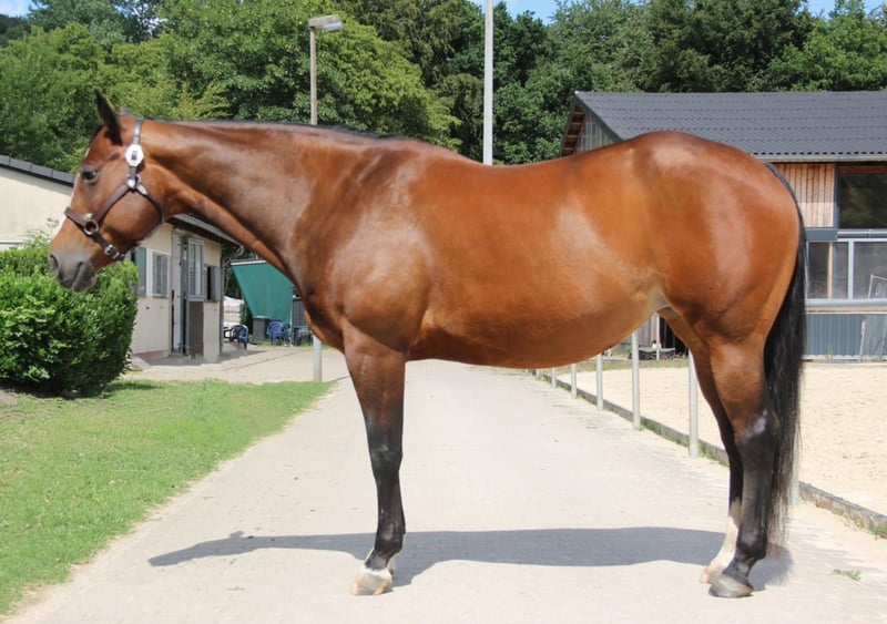 Good Chance Tobebest, also known as Eliza, is a direct daughter of RL Best Of Sudden out of a mare by A Good Machine that was shown in the US. A top pedigree for versatile breeding! Eliza won the DQHA Futurity Halter Class as a three-year-old, received a well-rounded training under Stefanie Bubenzer, and has been successfully shown in both amateur and open classes under saddle. She has never been lame and is free of health issues. Eliza is tested N/N on the 6-panel genetic test, and she is accustomed to trailer loading, farrier work (barefoot), veterinarian visits, as well as walks and rides out in the field. In 2022, she foaled a promising foal by Aint It The Blues, which is currently in training with Marina Schwank. She accepted the foal easily, and the birth was uncomplicated. Current health records, including an AKU and X-ray images, are available. At the moment, Eliza is in training with Manuela Berg, where she can be viewed and tried under saddle. Eliza is being sold for personal reasons to a loving home.