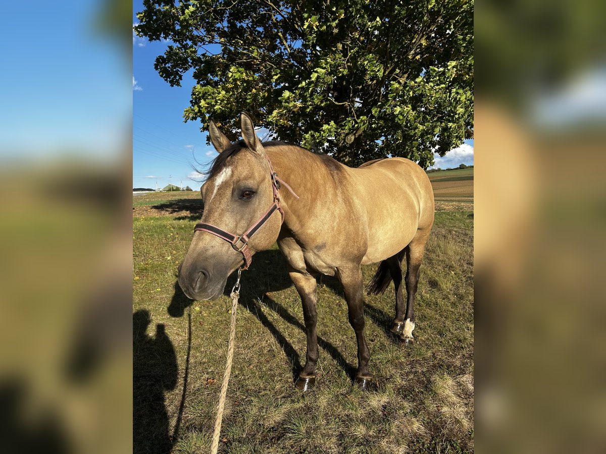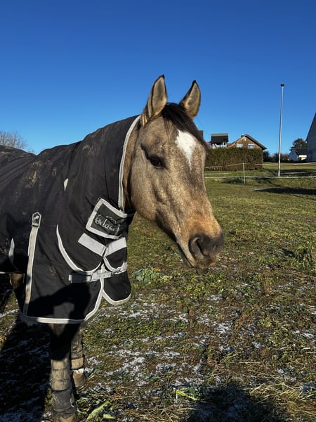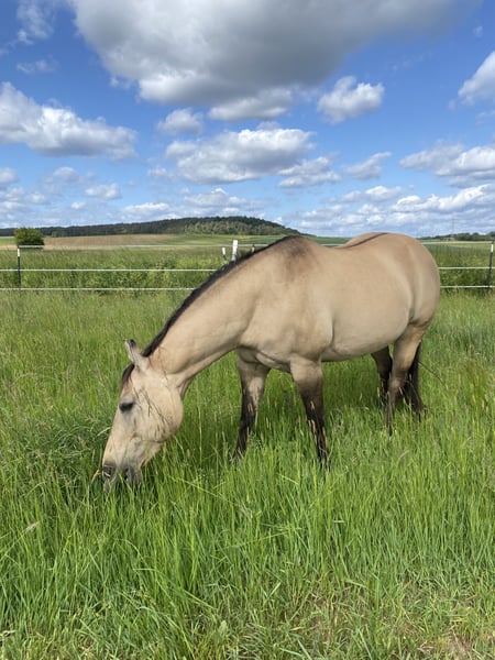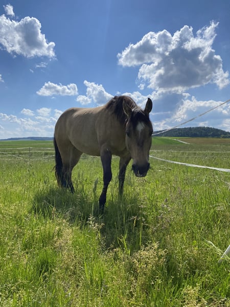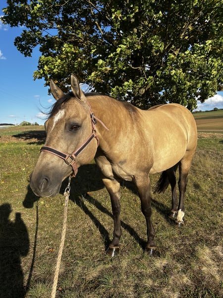 QH Stute - 12 Jahre - buckskin - ca. 1,49m Charakter und Ausbildung: - Charakterstark und sensibel zugleich - Kein Anfängerpferd - Liebt Bodenarbeit, Spaziergänge und läuft motiviert als Handpferd mit - Beherrscht Anfänge der klassischen Arbeit an der Hand, Seitengänge, Biegung, Rückwärts - Bestimmt auch für Freiarbeit und Zirkuslektionen zu begeistern - Auf Grund einer Verletzung nicht mehr sportlich belastbar - Leichte Ausritte für erfahrene, sichere Reiter möglich Haltung: - Offenstall oder Box mit täglichen Weidegang und im Sommer 24/7 Koppel gewohnt. - Kennt es auch mit Wallachen (sollten nicht hengstig sein) und Ponys zusammen zu stehen. Papiere: Half-Quarter-Horse - siehe letztes Bild. Weiteres gerne in einem persönlichen Gespräch. Ich suche für sie einen passendes liebevolles Zuhause, sie wird nicht an Händler verkauft.