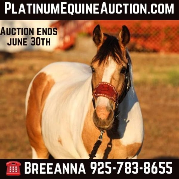 ONLINE AUCTION PLACE YOUR BIDS AT PLATINUMEQUINEAUCTION DOT COM $3500 STARTING BID AUCTION ENDS JUNE 30TH Pixie is the cutest little package. Buckskin paint with one blue eye and a whole lot of shape! Not only is she eye catching she’s the perfect partner ! This mare is the ultimate trail horse. She will do anything and go anywhere. 11yo grade mare. Standing at about 14hh but just as wide as she is tall. My husband in some of the photos and video is 6ft and does not look big on her. This girl does whatever is asked. Flags, tarps, traffic, water, quads, dirt bikes, tractors, arena work, drags barrels, logs, bridges, noodles. Smooth walk trot lope. She is a more forward mover. Absolutely no buck bolt rear. This is the ultimate step up for a kid that wants to mess around, or even adult who wants their confidence back! Easy keeper, currently barefoot. Utd on worming, shots. She was in a 4 acre pasture before I moved. Easy to catch. Great with the other horses. Now in a stall and also great! Loads and hauls good. Ties, bathes, saddles and bridles. Great little horse to pattern for junior rodeo, take out on a trail ride, or go do some ranch work. Anyone will be lucky to add this girl to their home. Please feel free to call me with any questions. Breeanna Fraizer 925-783-8655 currently located in valley springs ca.