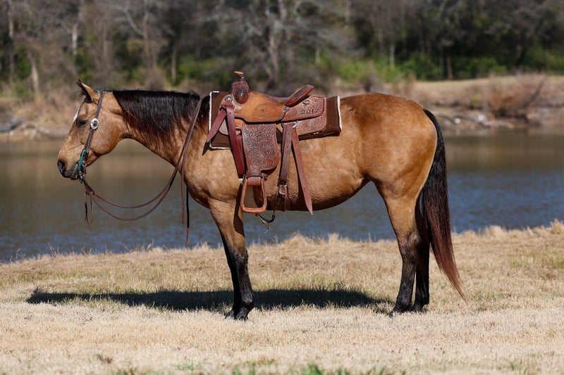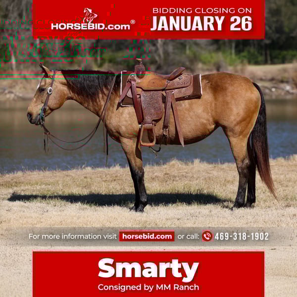 𝐉𝐀𝐍𝐔𝐀𝐑𝐘 ⭐️𝑨𝒍𝒍 𝑺𝒕𝒂𝒓 𝑳𝒊𝒏𝒆𝒖𝒑⭐️ Happening now thru MONDAY | JANUARY 26th - Available EXCLUSIVELY on HorseBid's website! For more details and to register visit: www.Horsebid.com CONSIGNOR CONTACT: MM Ranch 469-318-1902 LOCATION: Forney, TX BREED: Quarter Horse REGISTERED: Yes REGISTERED NAME: LADIGOS MULAN COLOR: Buckskin HEIGHT: 14.3 AGE: 13 GENDER: Mare •YOU GET THE HORSE AND THE SADDLE!! Yes that’s right you buy this horse you get the trophy saddle she won too. 🐴🏆 🤓Smarty is an AQHA registered dappled buckskin mare that is a 🏆 Finished winning tie down calf roping and breakaway roping mare. This is one you don’t see come up for sale very often. She is at the prime age of just 13 yrs old and stands the perfect size of 14.3 hands tall. Not too big but not too small. If you are looking to win, this is your girl. Smarty would be ideal for a high school kid or college kid that wants to compete and win. She has been owned and trained by a 75 yr old man. He competed and won a lot riding her. She is a fancy girl. You talk about all the bells and whistles on her. She has all the athletic ability you could want in one. She spins, slides, and runs to one. She is fast and quick. Don’t get me wrong. She is super quiet and easy to ride but when you are roping calves in the arena she is in there to WIN. She has also been used in the team shorting and amateur cutting classes. She can do it all. And she loves it. She has been well trained and is very versatile. She had an excellent foundation put on her when she was younger. She has been used out on a ranch and has all the real world experiences. She is the total package. Which also is a plus that she is really broke and easy to ride. She is that old school foundation one hand broke. So if roping is not your thing you can use her trail ride or ride around the ranch to check your cows. We have took her out of the trails and rode her through town. She is perfect. She is not spooky, crosses water, bridges, sure footed. No bad habits at all. Been rode by all ages. •Smarty sells 100% sounds with no issues. She did have a pre vet evaluation done which is included in the pictures. If you have anymore questions about her feel free to call. We would love to visit with you about her. We can help you arrange fast affordable shipping anywhere. She is up to date on all vaccinations, worming, had her teeth checked, feet. She is ready to go.