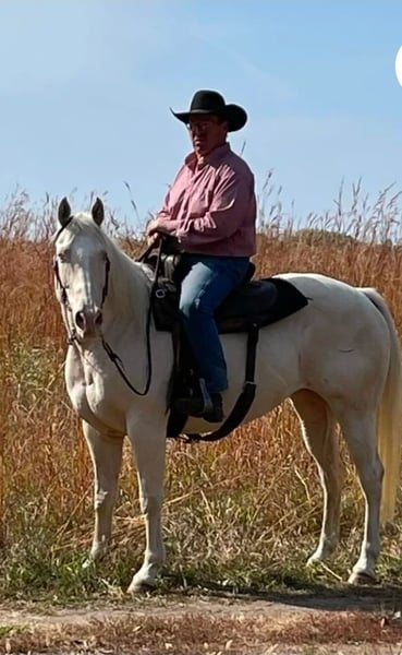 "AVAILABLE ON ONLINE HORSE AUCTION AT www DOT PlatinumEquineAuction DOT com BIDDING OPEN NOW thru SUNDAY | APRIL 26TH! *Final price will be determined on auction site* CONSIGNOR CONTACT INFO: Tina Haywood 817-559-4465 LOCATION: Grandbury, TX Tracy Of Memory Lane is a 12-year-old registered AQHA Cremello mare that is suitable for the whole family. She stands 15 hands tall and weighs approximately 1150 pounds. She has a lot of muscle and great confirmation. She has a beautiful halter head with short ears. She has a deep heart girth and a big hip, all four straight legs, and great hooves. Tracy‘s temperament is very docile and gentle. She is laid-back and sweet. Tracey loves attention. She has something for the whole family, she loves attention, and she meets you in the pasture. She is slow and confident for the little inexperienced ones and she is surefooted and very well broken for the experienced ones in the family. She has been shown in 4-H and has been ridden in parades during holidays. She has moved cattle on the farm and in the arena. Tracy is an excellent trail horse & has been ridden on big trail rides such as Palo Duro Canyon and Matzel’s game reserve. She is used to wildlife, trucks, tractors, skid loaders, and trains she has no spook or buck. She has no bad habits. Tracy stands like a statue to mount and dismount, whether it be from the ground or a mounting block. Tracy has no problems on trails with crossing water, ditches, logs or unlevel terrain. Her ground manners are impeccable. She is good with her feet. She hauls, clips, and bathes like a statue. Tracy is 100% sound in every way, whether it be riding or breeding if you’re looking for a total package for the whole family, Tracy is dependable, gentle, and surefooted. She’s also been used for lessons for multiple children and has also been used to pony other horses, truly sweet and sensible. Please contact Tina at 817-559-4465 for more information.