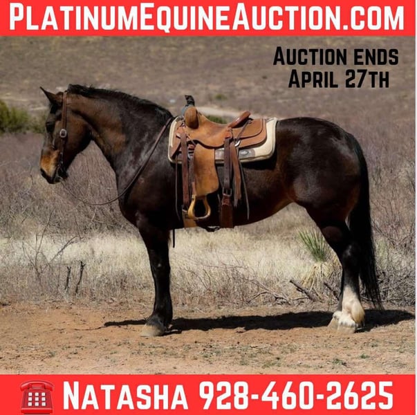 ONLINE AUCTION Place your bids at www.PlatinumEquineAuction.com Starting Bid $3500 Auction ends April 27th, 2025 Need a new saddle? Check out White Rock Saddles on our website or Facebook! Big Betty is a grade 12 year old Percheron cross mare standing 15.3hh. This big stout mare is an absolute blast to ride!! Whether you’re looking to hit the trails or cruise around the arena Big Betty is your gal! Big Betty will stand at a mounting block to be mounted, walk, trot, and lope both ways with ease. Flawlessly pick up both her leads, neck rein, sidepass, move off your legs, and has a good stop! Big Betty is just as fun to ride outside as she is in the arena!! Despite her size, she is very surefooted, cautious, and will go through absolutely anything in front of her. The busy streets of town, flowing rivers, fallen logs, brushy areas, rigid rocky terrain, steep slippery slopes, you name it and Big Betty will go on through it, surefooted as can be taking great care of you every step along the way! Big Betty is good to catch and easy to groom, saddle, bridle, bathe, and load! Will come with a clean coggins and health!! Transport can easily be arranged anywhere in the US!! Located in Camp Verde, AZ. Contact D/C Equine Services Dallas 804-822-2233 Natasha 928-460-2625 ONLINE AUCTION Place your bids at www.PlatinumEquineAuction.com Starting Bid $3500 Auction ends April 27th, 2025 Need a new saddle? Check out White Rock Saddles on our website or Facebook!
