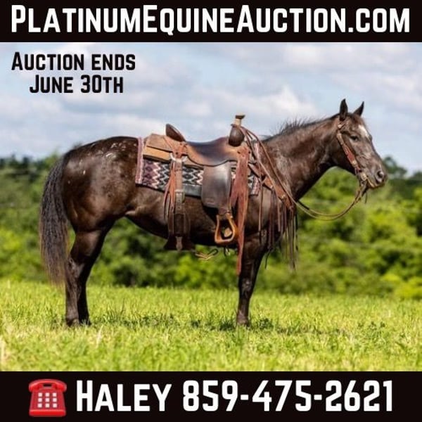 ONLINE AUCTION PLACE YOUR BIDS AT PLATINUMEQUINEAUCTION DOT COM $3500 STARTING BID AUCTION ENDS JUNE 30TH Here’s Betty! Betty is a 12 year old Appaloosa mare! She’s is the perfect size, standing at 14 hands and weighing 1050 pounds. She has a beautiful conformation. Big hipped and wide chest! She has the frame to carry any size rider! She is BEGINNER SAFE and FRIENDLY! She has been used on the trails, in fun shows, and used for lessons. She is super gentle and ultimately safe for any rider! On the trails, she will ride in the front or the back. She is sure footed and will cross any obstacle when asked. She’s a beginner’s dream trail horse. She is stylish, honest and classy. Very easy going, just drop her reins and enjoy the ride! Betty has also been used on the farm, from checking fence, packing the smallest cowboys and cowgirls for the day and riding around the cattle. Betty will direct rein, neck rein, back, walk, trot, & lope on both leads. Simply turn her on and turn her off, she will step directly down from a lope back to a walk with grace. She is very easy to ride and very simple to maneuver. She will work of leg cues as well. She will stand to be saddled, bridled, groomed and shod. If safety, style and brains are your priorities- Betty is a dream come true. From neighboring kids climbing all over her, to asking her to push cattle, to given riding lessons; Betty checks all the boxes. She is consistent and willing in everything she does. Whether you’re looking for a beginner horse or a confidence builder; Betty fits the bill. For any other information please contact PR Quality Horses Colton 606-748-9009 or Haley 859-475-2621 ONLINE AUCTION PLACE YOUR BIDS AT PLATINUMEQUINEAUCTION DOT COM $3500 STARTING BID AUCTION ENDS JUNE 30TH