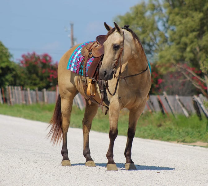 ONLINE AUCTION Place your bids at www.PlatinumEquineAuction.com Starting Bid $3500 Auction ends August 11th, 2024 Need a new saddle? Check out White Rock Saddles on our website or Facebook! They don’t come anymore perfect than this pretty little gal we’re about to Introduce you to ! Butters is a 12 year old buckskin mare standing 14 hds tall . Shes absolutely SAFE for any level rider and will be safe for anyone from 5 to 85 . We trust Butters with everyone ! Butters is the funniest gal to go cruise around on , she’s user friendly and you don’t have to be a cowboy to ride her . She is happy to do whatever you ask of her , she will go out down the trail by herself or in a group . She will cross water , logs , bridges and tarps and whatever else you may come across down the trail with zero hesitation. She is confident all while taking care of her riders . She is the perfect mount for everyone including the littles to enjoy from the trails to arena work . Butters is always a trooper when being rode in town with the heavy traffic , crowds of people and is always the first one to get loved on by everyone . She is the sweetest mare and loves attention always being the first one to greet you in the barn . In the arena she has smooth gaits and transitions . We have gave numerous lessons on her for all levels of riders , she is very forgiving and always try’s 100% to please. She will walk , trot and lope circles , she has a true neck rein on her , moves off of your legs. She is the perfect addition to anyone’s family and not only is she the perfect size she’s Americas favorite color ! She loads and unloads off the trailer great . Stands great to tack up and easy to bridle . Butters is also one you can jump on bareback with a halter and take out for a ride . She clips , ties , stands for the farrier and bathes like a dream. She is truly a unicorn that everyone searches the world for! Call us to schedule a time to come try her out or we can set up a FaceTime call. If you need help with transport don’t hesitate to ask we have a list of reputable haulers that can get her safely to your doorstep world wide. Contact M$ Perf. Horses Michelle 661-817-9120 with any questions. Located in Stephenville, TX. ONLINE AUCTION Place your bids at www.PlatinumEquineAuction.com Starting Bid $3500 Auction ends August 11th, 2024 Need a new saddle? Check out White Rock Saddles on our website or Facebook!