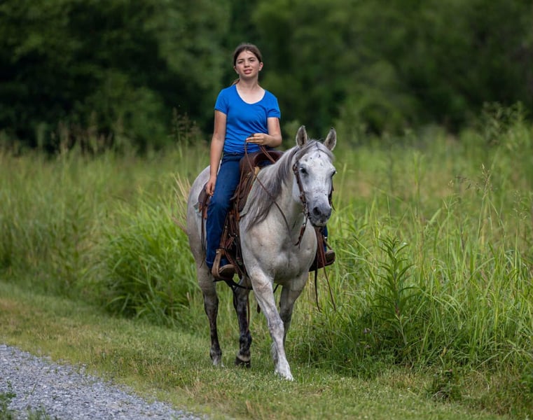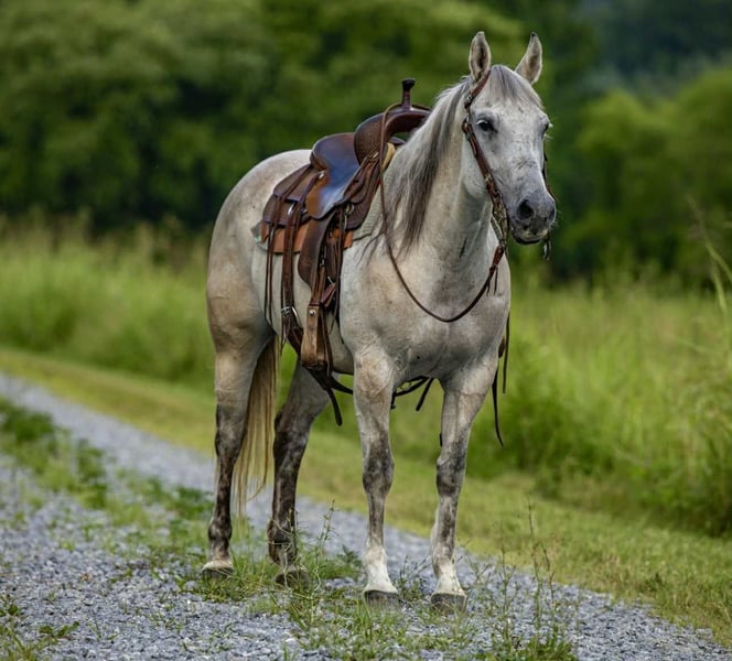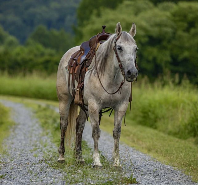 ONLINE AUCTION Place your bids at www.PlatinumEquineAuction.com Starting Bid $3500 Auction ends July 27th 2025 Need a new saddle? Check out White Rock Saddles on our website or Facebook Teacup is a 13yo grade gray mare that stands 14.2 hands. When I think of teacup 3 words pop into my mind, honest, reliable, and trustworthy. Teacup is the kind of horse you want to ride, whether it be 100° or -8° it doesn’t bug you to saddle and ride, because she’s just that good ! Teacup is not your typical mare, quite honestly I believe she identifies as a gelding, she is happy to see you, happy to be with other horses, and just happy all the time ! Teacup stands to be saddled, bridled, tacked, she loads with ease and is good in a stall or turned out. Teacup stays broke with time off and saddles up gentle no matter the weather, or time she’s been standing. Are you wanting a pint sized horse that’s stout enough to carry just about anyone ? Something easy to get on and off of on the trails ? Then teacup is your gal, although she is small, she’s mighty and can keep up with the big horses or can slow it down and drop your reins and she will ride like a snail. In the arena teacup will walk trot lope circles, she pivots and is soft in her face and sides, she has a nice light neckrein and moves off your legs as well. We’ve used teacup a lot outdoors, we check momma cows on her daily, we use her to pen back at the stockyards, and she’s my go to horse to pony colts off of, she’s zero drama and no fuss. Teacup has seen lots of outside miles and nothing phases her, she crosses anything asked, and is traffic safe as well. There’s not a hill to steep or a creek to deep for teacup. One thing I really like about teacup is you can make mistakes on her and she just takes them in a stride, halterbreaking and ponying colts isn’t always ideal, and I’ve put teacup in alot of “messes” she always picks up the slack and gets me out of trouble with ease. Not only can you make mistakes, you can ride her and never have to worry, I ride a lot of young horses and stepping on teacup is like a breath of fresh air, she’s always sane and reasonable about everything asked of her. I’ve given some lessons off of teacup and she adapts and adjust to each rider, timid? No problem! Confident? Also no big deal, teacup got ya! If you’re wanting a horse with a ton of heart, sense, and a good head on her shoulders than I suggest you consider teacup, she’s guaranteed to steal your heart in many ways! For more info contact Justyce Small 606-748-0066. Located in Wallingford, KY. ONLINE AUCTION Place your bids at www.PlatinumEquineAuction.com Starting Bid $3500 Auction ends July 27th 2025 Need a new saddle? Check out White Rock Saddles on our website or Facebook