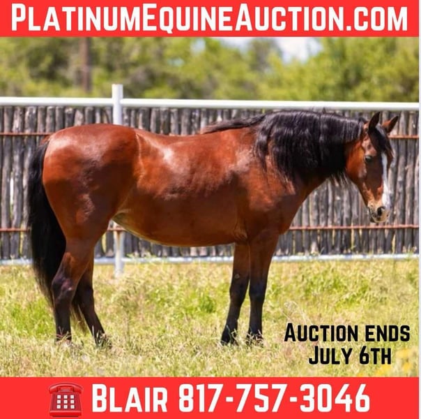 ONLINE AUCTION Place your bids at www.PlatinumEquineAuction.com Starting Bid $3500 Auction ends July 6 2025 Need a new saddle? Check out White Rock Saddles on our website or Facebook! Clover is a 14.1H, thicker than a Snicker bay 13 yr old bay mare. She is extremely sweet and always aims to please. This one is GENTLE GENTLE and kind enough for all ages to get along with. Clover was used by the Amish to pull a cart and to ride. She’s quite like a most horses that come off the Amish are. She’s very “go with the flow” and is happy doing whatever you ask her to. She’d be the perfect trail horse for anyone looking for a steady ride, lesson horse, or beginner horse. Clover is one of the kindest souled horses we’ve had. She’s a joy to have around, stands quite on the tie rail forever, loads, leads, bathes and ties all perfectly. She’s loves attention and melts anytime you love on her. She rides great and has been rode bareback a lot as well! She goes where you point her at the exact speed you ask! She isn’t spooky or watchy in the slightest and has ZERO buck, bolt or rear! We haven’t found anything we don’t like about her. Clover is such a sweetheart and will go on to make someone really happy! Go to her website page Northtexashorsecompany.com/clover for more pictures and footage! Please call Blair with North Texas Horse Company for more info at 817-757-3046. We are located in Weatherford, TX and can help arrange affordable shipping to anyone!! ONLINE AUCTION Place your bids at www.PlatinumEquineAuction.com Starting Bid $3500 Auction ends July 6 2025 Need a new saddle? Check out White Rock Saddles on our website or Facebook!