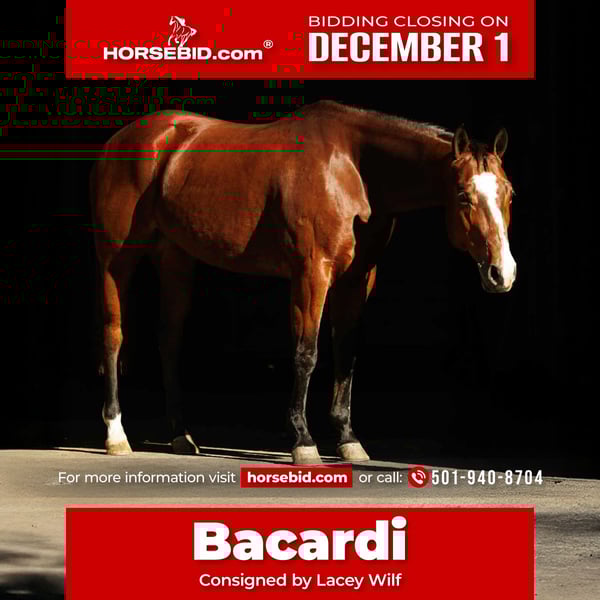 ⚜️ 𝓽𝓱𝓮 𝐇𝐨𝐫𝐬𝐞𝐦𝐚𝐧'𝐬 𝓢𝓱𝓸𝔀𝓬𝓪𝓼𝓮⚜️ Happening now thru MONDAY | DECEMBER 1st - Available EXCLUSIVELY on HorseBid's website! For more details and to register visit: www.Horsebid.com CONSIGNOR CONTACT: Lacey Wilf 501-940-8704 LOCATION: Quitman AR BREED: Quarter Horse REGISTERED: Yes REGISTERED NAME: Coco Goldseeker COLOR: Bay HEIGHT: 15 AGE: 14 GENDER: Mare Bacardi is a refined, well-seasoned 2011 mare who brings elegance, capability, and maturity to every ride. Standing a well-proportioned 15 hands, she offers that ideal, versatile size appreciated by a wide range of riders. Registered as “Coco Goldseeker”, she carries a timeless Goldseeker × Streakin Six pedigree—proven, classic, and celebrated for its balance, brains, and longevity—and she is proudly 6-panel negative. Her background blends quality breeding with real-world experience, giving her both polish and practicality. On the trail, Bacardi is effortlessly composed. She navigates all terrain with confidence—water, timber, rock, brush, bridges, steep country, and unfamiliar ground—always stepping forward with intention and balance. She stays unbothered around dogs, traffic, machinery, and the bustle of farm life, making her the kind of mare you can trust anywhere, anytime. With her steady, uncomplicated nature, she’s well-suited to riders of all experience levels who appreciate a confident, dependable partner. Her sale-barn résumé only adds to her value. Bacardi has been used to pen cattle, sort, move pairs, and load trucks, handling pressure and noise like a true professional. She walks into busy environments with a calm, businesslike mentality and simply goes to work. In the arena, she offers a smooth, collected way of traveling that makes every ride feel elevated. She picks up both leads with ease, stays soft in the bridle, and holds a steady, rhythmic cadence. Uncomplicated and responsive, she is very much a point-and-go ride—simple, agreeable, and consistent no matter who swings a leg over. Her ground manners are polished and uncomplicated. She saddles and bridles quietly, handles with grace, and loads and hauls with complete ease—making her simple and stress-free to take anywhere. For anyone seeking a mare with class, seasoning, and reliability wrapped in an elegant, user-friendly package, Bacardi is the complete offering. Confident, capable, and beautifully broke—she is the kind that elevates any program. Soft-minded, well-bred, and 6-panel negative, she also carries the credentials to transition seamlessly into a breeding program.