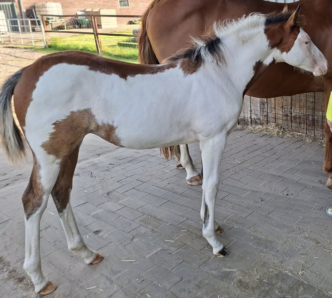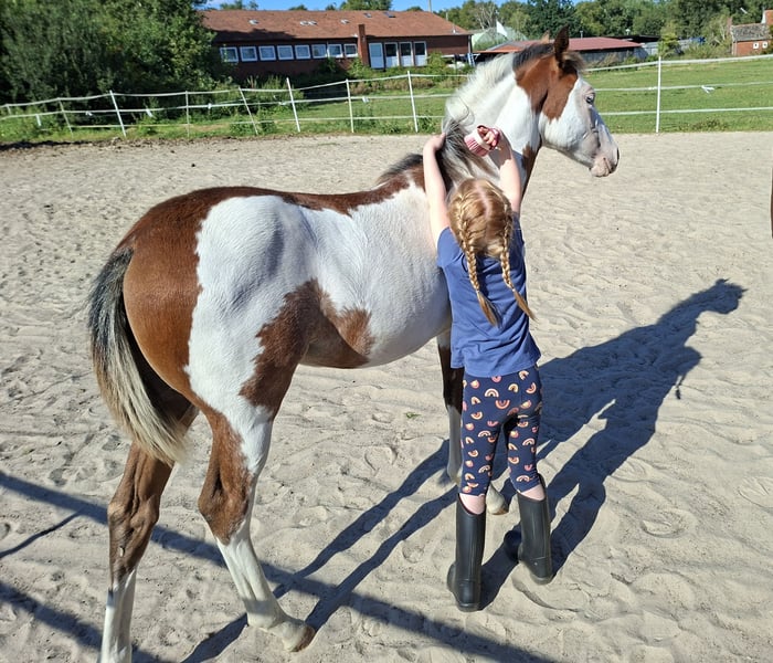 Quarter Horse/Paint Mare – geschikt voor recreatief gebruik of wedstrijdsport Te koop staat een gezonde, levendige bontmerrie, geboren in 04/25. De merrie valt op door haar compacte, correcte bouw en veel "Lady Charme". Ze wordt in een outdoor stal gehouden, maar kent ook boxenstallen en wordt uiteraard regelmatig ontwormd en voorgesteld aan de hoefsmid. Haar robuuste constitutie en evenwichtige karakter maken haar tot een ideale partner voor recreatief gebruik of in de wedstrijdsport. In omgang is ze open en nieuwsgierig en staat ze open voor nieuwe prikkels. Haar moeder (vos, zie foto) is een Quarter Horse-merrie. De vader (laatste foto's) is een gekeurde dekhengst – Moonlight Bandit, gekeurd met 8,4 punten door ZSSE e.V. als Europees Westernpaard. Wie dus op zoek is naar een "Eye Catcher" met uitstekende eigenschappen, neemt graag contact op om verdere details te bespreken en een persoonlijk indruk te krijgen.
