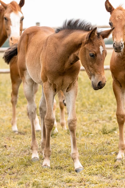 Polly is a very outgoing and affectionate filly from successfully shown parents. She is halter-trained and familiar with the basics of foal handling. Her 3-year-old full sister and parents can also be viewed. She is eligible to compete in NRHA Germany and Belgium. EWU can be paid in upon request. The price is a weaning price. Please feel free to contact us with any further questions.