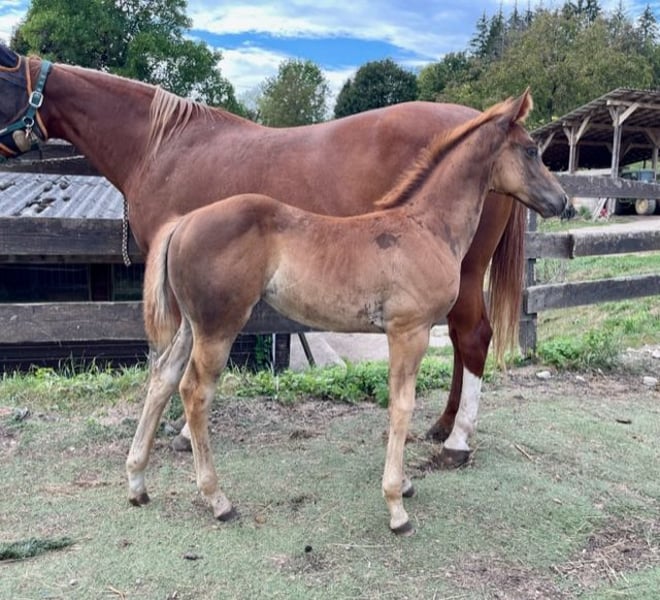 Pour notre « ANNIE » (ZIPPOS BLUE FIRE), nous recherchons également une famille d'accueil 5 étoiles. Cette magnifique jument Quarter Horse, née en 2024, est née chez nous. Ses parents vivent également sur notre ferme : Mère : TL Blue Alice (Aint It The Blues) Père : Zippos King Bar Annie est une véritable beauté, avec un look remarquable : Sa robe est difficile à décrire : un brun/gris foncé avec une légère touche cuivrée au soleil. Elle possède également des yeux très expressifs, d’un gris foncé à bleu, ce qui en fait une véritable attraction visuelle ! Elle a une silhouette harmonieuse et une tête à faire fondre le cœur ! Elle se déplace avec une aisance exceptionnelle et convient aussi bien pour des compétitions que pour la balade. Si vous cherchez quelque chose de vraiment exceptionnel, Annie sera la perle rare. Elle a déjà appris tout ce qu’il faut à son âge : donner les pieds, se faire présenter chez le maréchal-ferrant, être brossée, lavée, promener ou mener en main. Annie possède un passeport européen pour équidés délivré par la DQHA et les papiers américains (certificat d’enregistrement) de l’AQHA. Nous la vermifugeons régulièrement et la présentons chez le maréchal-ferrant. Elle est actuellement encore avec sa mère chez nous, en élevage. Elle peut rester ici pour continuer sa croissance ou partir dans sa nouvelle famille. Si vous souhaitez faire connaissance avec Annie, n’hésitez pas à nous contacter.