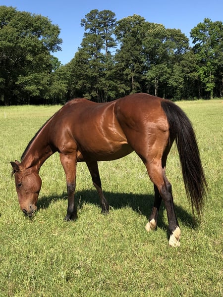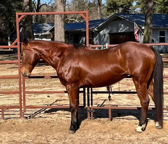AQHA registered Liver Bay Mare for sale. 2001 but don’t let that stop you from considering this 24-year-old horse! If you are looking for a stable, level headed mare you can take in the arena or out of the trial, this is the mare for you! Extensive training as a young horse is Halter, Western Pleasure, Equitation, Reining, and can bring back and handle a steer or two. This is your girl. She is good sized but under 16 hands so you can jump on bareback or ride saddled. She will stand quiet, loads the trailer easy and will haul where ever you want to take her. Sound feet and legs, stands quiet for the farrier. You can vet her with no issue. She loves baths and the water and will cross a stream if you ask. This is a push button mare that is very healthy and will have a good 10 plus more years of service for you. I can’t stand by and see her stalled in my barn and not being ridden. There is nothing hidden here and she is exactly as I describe her as. If you are looking for sure footed, sound, calm, reliable ride, don’t let my mare pass you by. This mare has the pedigree that is the Who’s Who of horses which bring genetics and decades of solid AQHA breeding. Foundation on top and bottom that brings a stable, calm horse From Two Eyed Jack and Poco Bueno, to Sugar Bars all the way back to Man O’War. She is priced to sell but not to just anybody. I will check references and would like to see her go to someone who will appreciate a nice ride every time you take her out. She is a kind soul with soft eyes and great disposition.