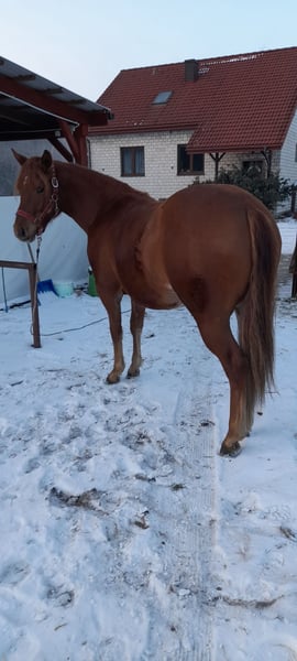 Zweijährige Quarter-Horse-Stute mit Trainingsabstammung. Sie hat Potenzial für den Hochleistungssport und eignet sich auch hervorragend als Familienpferd. Regelmäßig beschlagen, geimpft und entwurmt. Sie ist gut erzogen, leinenführig, respektvoll gegenüber ihrem Hirten, mutig, gesund und sehr kräftig gebaut. Aktuell ca. 138 cm groß, wächst sie noch 8 cm. Keine Mängel. Sie besitzt einen polnischen Pass und ein AQH-Prüfzertifikat. Sie lebt in der Nähe von Konin, Großpolen. Kontakt per Telefon oder WhatsApp: +49 664 550 570