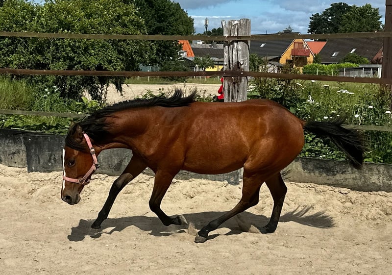 Rain Smart Dragon - wundervoller Quarter Horse Stutjährling, geboren 6.24 mit einem geschätzten Endmaß von 150 cm, sucht ein 5-Sterne Zuhause. Dieses junge Talent bringt alles mit, was man sich von einem zukünftigen Verlasspferd wünscht. Sie ist absolut aufgeklärt und meistert das Fohlen ABC mit Bravour. Rain kennt Kinder, Hühner, Hunde, Katzen, Autos und diverse Maschinen. Immer super interessiert und nie schreckhaft oder ängstlich. Die Stute hat ein unglaubliches Vertrauen in den Menschen. Auch in der Herde benimmt sie sich vorbildlich und kommt mit Großen/Kleinen/Alten und Gleichaltrigen super zurecht. Rain ist sehr aufgeschlossen und sozial. Anbinden, abduschen, unterm Bauch herkrabbeln, Hänger fahren - nichts bringt sie aus der Ruhe. Einfach ein Traum Jährling, die für alles zu haben ist. Rain ist bestens geeignet für Reiter, die einen vielseitigen Partner im Westernbereich suchen. Egal ob Trail oder Reining oder Allround ? sie hat das Potenzial, in verschiedenen Disziplinen zu glänzen. Ihr Vater ist Wee Hollywood Dragon und Rains Mutter ist Footworks Finest gezogen . Wenn Sie auf der Suche nach einem Nachwuchspferd mit hervorragenden Anlagen und einem freundlichen Wesen sind, dann könnte diese QH Stute genau die richtige sein.