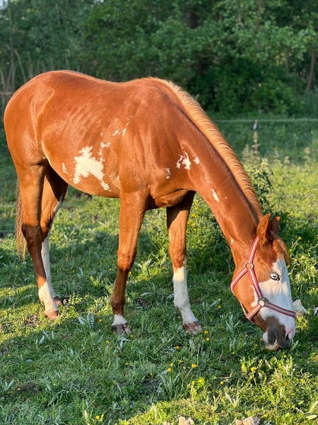 Stute Panels getestet, alles negativ, außerhalb Träger LWO. Sehr menschenbezogene Stute, schöne Statur (Videos über WhatsApp). 2 blaue Augen, keine Mängel. Ende Stockmaß geschätzt auf 1,52 m. Kennt Schmied, Dusche, Verkehr, Transport läuft problemlos auf dem Anhänger. Bereits an der Longe mit Longiergurt. Nimmt alles schnell auf. Farbenpanels sind ebenfalls vorhanden, ordentlich entwurmt. Auch Equipment vorhanden.