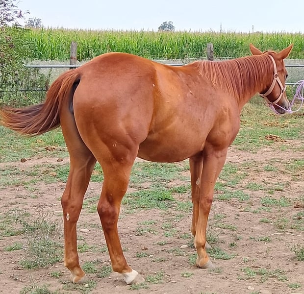 Offriamo in vendita una splendida puledra Quarter Horse di 18 mesi, figlia dell’eccellente stallone Colonels Dancing Gun, discendente diretto di Colonels Smoking Gun "Gunner", uno dei riproduttori più influenti nel mondo del reining. 🔹 Nome: Bambola Dancingun 🔹 Razza: Quarter Horse 🔹 Età: 18 mesi 🔹 Sesso: Femmina 🔹 Origini: Figlia di Colonels Dancing Gun – stallone riconosciuto, performante nel reining, con progenie nota per il suo carattere equilibrato, facilità di apprendimento e conformazione armoniosa. 🔹 Temperamento: Molto dolce, curiosa e tranquilla. 🔹 Vita sociale: Cresciuta in branco, favorendo un carattere sereno e ben equilibrato. 🔹 Manipolazione: Abituata alla manipolazione quotidiana, anche in presenza di adulti e bambini. Ideale come cavalla da famiglia o da svago, con buon potenziale per lo sport. 🔹 Salute: Ottima. Visita veterinaria completa e radiografie disponibili. Questa giovane cavalla possiede tutte le qualità desiderate: un carattere d’oro, ottime origini e una base sana per una carriera sportiva o ricreativa. Saprà evolversi positivamente tra mani esperte, sia per lavoro a terra, reining o altre discipline western. Visibile a Cuneo (Piemonte, Italia).
