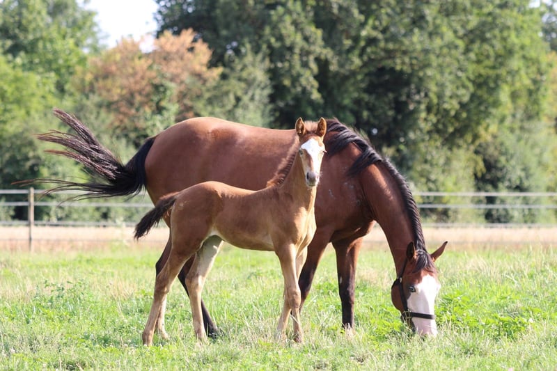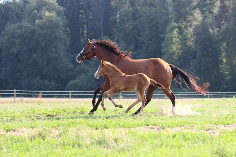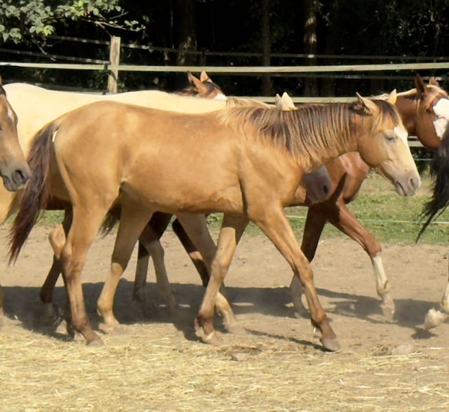 MOBSTERS CHAMPAGNE est une pouliche expressive et magnifique dans la couleur de rêve amber champagne splash, à vendre avec une excellente lignée. La petite est très attentive, ouverte et confiante, elle aborde tout ce qui est nouveau avec intérêt. Née le 06.06.2023. Taille finale attendue : 1,43 m. Fondament solide, os stable et un beau corps avec des mouvements félins en finition spéciale. Père : Triple Frozen Dunit Mère : Mobsters Lil Chic (par HF Mobster x Einstein)