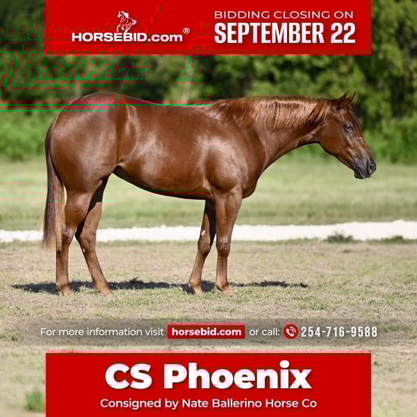 🍁𝒕𝒉𝒆 𝐅𝐀𝐋𝐋 𝑺𝒑𝒆𝒄𝒕𝒂𝒄𝒖𝒍𝒂𝒓🍁 Happening now thru MONDAY | SEPTEMBER 22nd - Available EXCLUSIVELY on HorseBid's website! For more details and to register visit: www.Horsebid.com CONSIGNOR CONTACT: Nate Ballerino Horse Co 254-716-9588 LOCATION: Waco,Tx BREED: QH REGISTERED: Yes REGISTERED NAME: CS Phoenix COLOR: Sorrel HEIGHT: 14.2 AGE: 2 GENDER: Mare