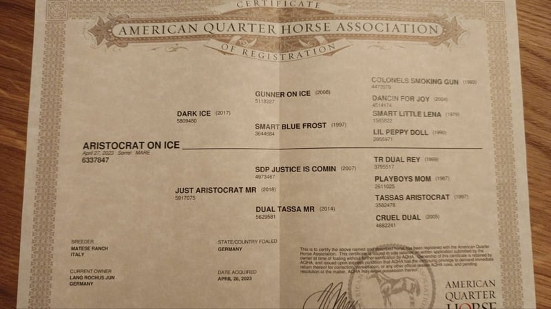 Serafina came to us as a few weeks old foal at her mother's side and has grown into a confident and friendly young mare in our herd. She is 5 Panel N/N through her parents, knows the basics of foal training, and behaves well with the farrier and veterinarian. She is quick and agile, and due to her lineage, she certainly has talent for cowhorse. Her mother was raised at the Matese Ranch in Italy, which is known for breeding good cowhorses. Her father, DARK ICE, is a son of GUNNER ON ICE and has been/is being shown by Markus Schopfer. For more information, feel free to call: 0174/3028346.