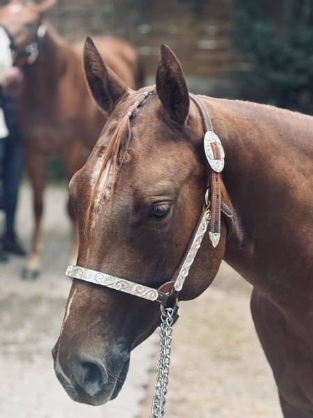 For Sale: American Quarter Horse Mare – Dark Chestnut, born 2023 This beautiful two-year-old mare is by Unxpected out of a direct Blazing Hot mare. Her final height is expected to be around 16.0 hh. She was born here, just like four of her half-siblings. All of them are known for their kind, fearless temperament and easy trainability. The siblings are successfully competing in sport; one half-brother recently became Maturity, DQHA, and NSBA Champion Hunter Under Saddle at the Q25. Phoebe has been handled and ground-trained so far. She is ready to show in in-hand trail and longe line. During the summer, she was Reserve Futurity Champion in longe line and co-Reserve Champion in trail. She is farrier- and loading-friendly, regularly vaccinated and dewormed. Current clean X-rays are available.