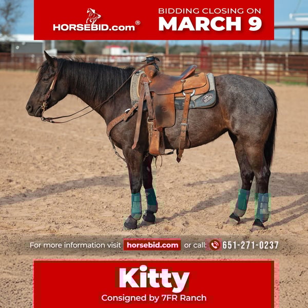 ℳ𝒶𝓇𝒸𝒽 ♦️𝐑𝐈𝐃𝐄𝐑'𝐒 𝐂𝐇𝐎𝐈𝐂𝐄♦️ Happening now thru MONDAY | MARCH 9th - Available EXCLUSIVELY on HorseBid's website! For more details and to register visit: www.Horsebid.com CONSIGNOR CONTACT: 7FR Ranch 651-271-0237 LOCATION: Normangee, TX BREED: Quarter Horse REGISTERED: Yes REGISTERED NAME: Owl Mooncat COLOR: Smokey Black HEIGHT: 14.1 AGE: 4 GENDER: Mare Kitty is a beautiful young mare with the mind, heart, and foundation every program hopes to find. She is exceptionally gentle and naturally kind, with the sweetest expression and quiet disposition that makes her a favorite. She’s safe to be around, easy to handle, and enjoys attention — the type that meets you at the gate and takes care of her rider every day. She has been started correctly from the very beginning with a solid reining foundation, giving her soft face, correct body control, and a great understanding of her cues. She lopes around low-headed and balanced, moves pretty and fluid through her transitions, and carries herself with that classy, relaxed look everyone wants. Kitty is now tracking live cattle confidently and showing natural cow sense, making her an excellent prospect for ranch riding, reined cow horse, sorting/penning, or a dependable all-around partner. She is honest, willing, and truly wants to please — the kind of mare you can build a program around or trust your family to enjoy. Whether you’re looking for a safe horse, a versatile performance prospect, or simply a kind partner to grow with, Kitty checks every box. Please contact Molly Falconer for any questions. (651)-271-0237
