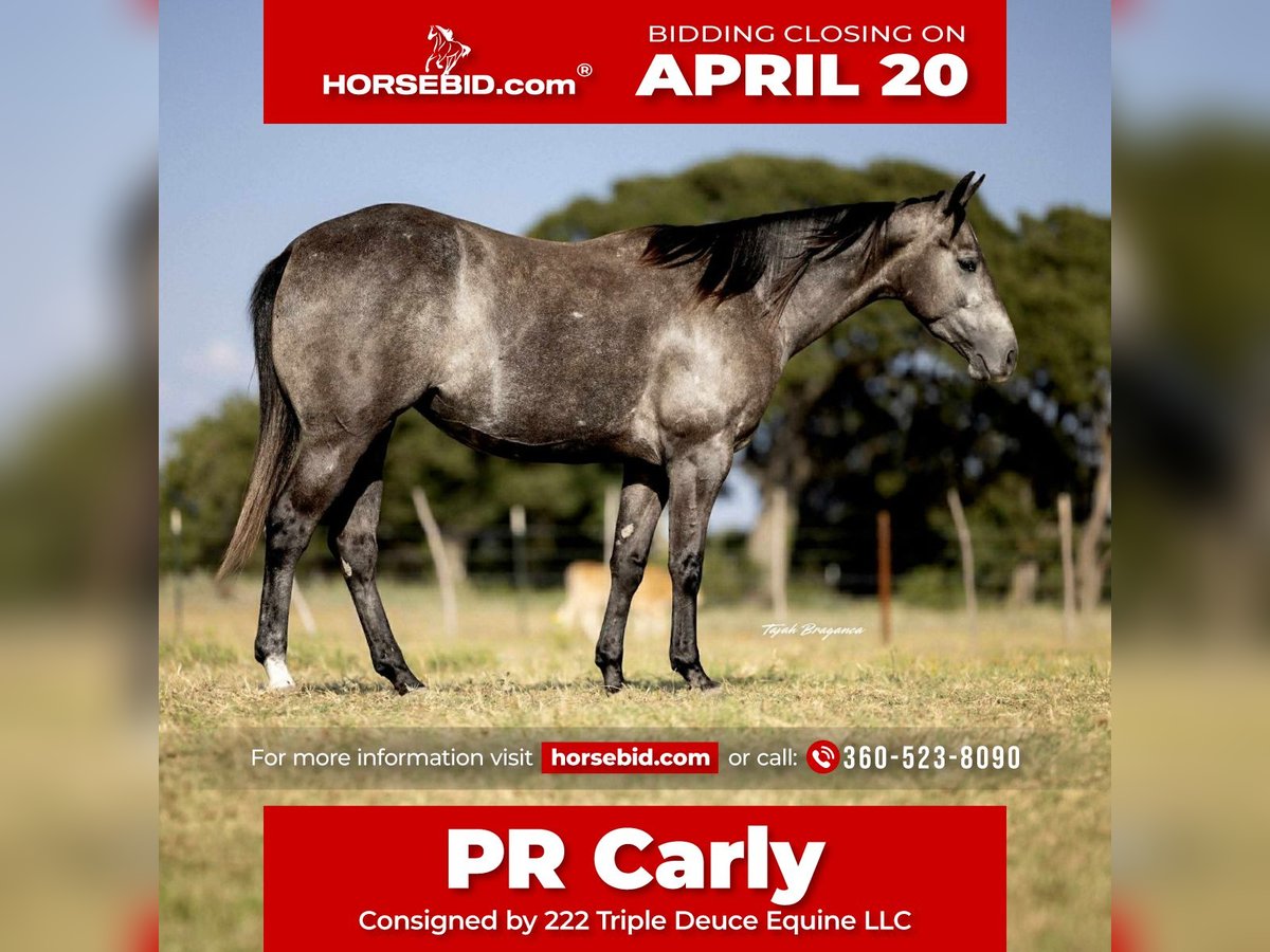 ⚜️𝐭𝐡𝐞 𝓔𝓵𝓲𝓽𝓮 𝐒𝐩𝐫𝐢𝐧𝐠 𝐂𝐥𝐚𝐬𝐬𝐢𝐜⚜️ Happening now thru MONDAY | APRIL 20th - Available EXCLUSIVELY on HorseBid's website! For more details and to register visit: www.Horsebid.com CONSIGNOR CONTACT: 222 Triple Deuce Equine LLC 360-523-8090 LOCATION: Cisco, TX BREED: AQHA REGISTERED: Yes REGISTERED NAME: PR Carly ⭐️ Phillips Ranch Bred & Riata Buckle Eligible ⭐️ COLOR: Grey HEIGHT: 14.2 AGE: 4 GENDER: Mare PR CARLY ⭐️ RIATA BUCKLE ELIGIBLE ⭐️ 2022 AQHA GREY MARE “PR Carly” is a Phillips Ranch bred-and-raised filly. By their great stallion “Curtis Done Dun It” Out of their mare “PR November Cash” We have personally had Carly in our barn for over a year now, and she has been a favorite! Carly has not been passed around and is as honest and true as one comes. You would drive a long way to find one with a demeanor and natural ability like hers. From the roping pen to riding lessons, this young mare has the mind and talent to handle it all. Carly is 100% gentle for anyone to ride—elderly, children, and adults alike. From novice to advanced riders, she can turn it up and bring it right back down. Carly is one-hand broke, very cowy, has been hauled to town, and takes everything in stride. Carly has been ridden many miles by an 80-year-old cowboy on a Brahman cattle ranch in East Texas as a 2- and 3-year-old. Standing water, deep mud, alligators, big bulls, cowbirds, dogs—she’s seen it all and will cross anything! You can do absolutely any kind of ranch work on this mare and get the job done. On top of that, lesson kids of all ages ride her, and she tolerates all the nonsense they throw at her! Outside the arena or inside, she is the same—always consistent. A point-and-shoot, no-nonsense kind of mare. Let her sit, and she will not get fresh or silly. She gets along with other horses and does not act marish. Meets you at the gate, with good manners, good feet, and clean legs. Take her to the show, or enjoy her at home! Cisco, TX Shipping Available 307-630-3578 – Brayden