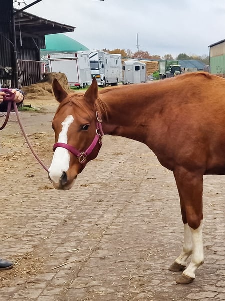 Spook N Honey - bildhübsche Jungstute, 2022 geboren mit einem geschätzten Endmaß von 150 cm, mit einem Charakter zum Dahinschmelzen. Sie kommt sofort wenn ihr Mensch auf die Weide kommt, lässt sich brav händeln und ist immer freundlich und aufgeschlossen. Die Stute durfte in Ruhe in einer kleinen Stutenherde im Offenstall aufwachsen. Kennt aber auch Box. Sie befindet sich in der Grundausbildung. 1- Jährig hat sie den Stadt&Dorf Trail gelassen gemeistert und 2 Jährig den Extrem Trail. Auch Anhängerfahren kennt sie und ist brav beim Tierarzt und Hufschmied. Honey weiß sich zu präsentieren. Eine vielseitige, liebe Partnerin, die sowohl im Sport als auch in der Freizeit begeistert wird!. Sie besitzt eine tolle Cutting/Allround Abstammung und wird mit vollen AQHA Papiere abgegeben. Eine klinische AKU wird im Rahmen des Verkaufes von der Züchterin in Auftrag gegeben. Ihr Preis steigt bei zunehmendem Ausbildungsstand.