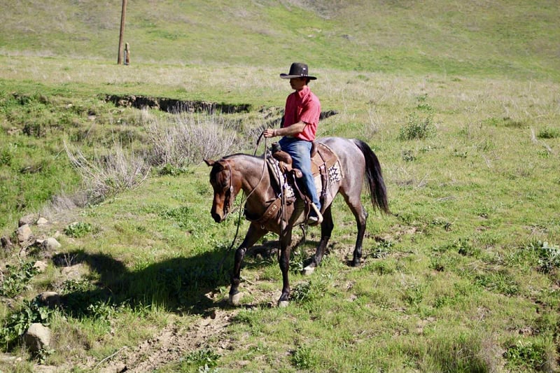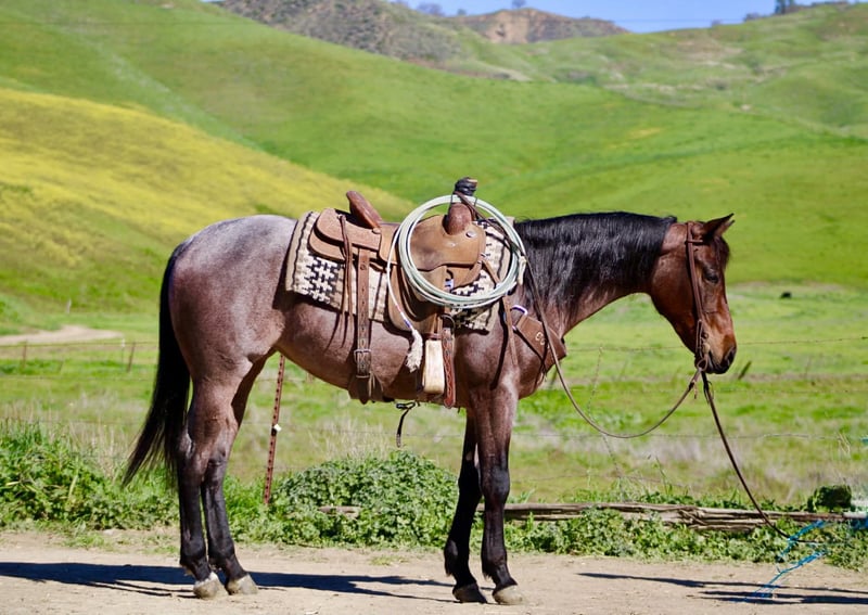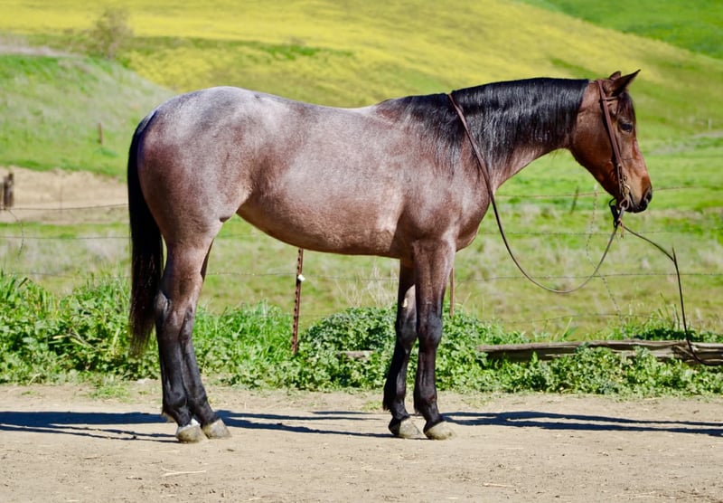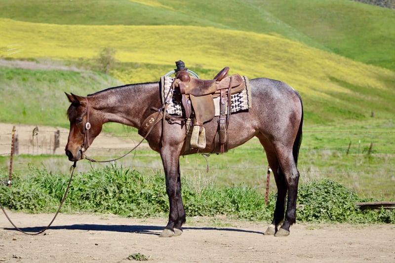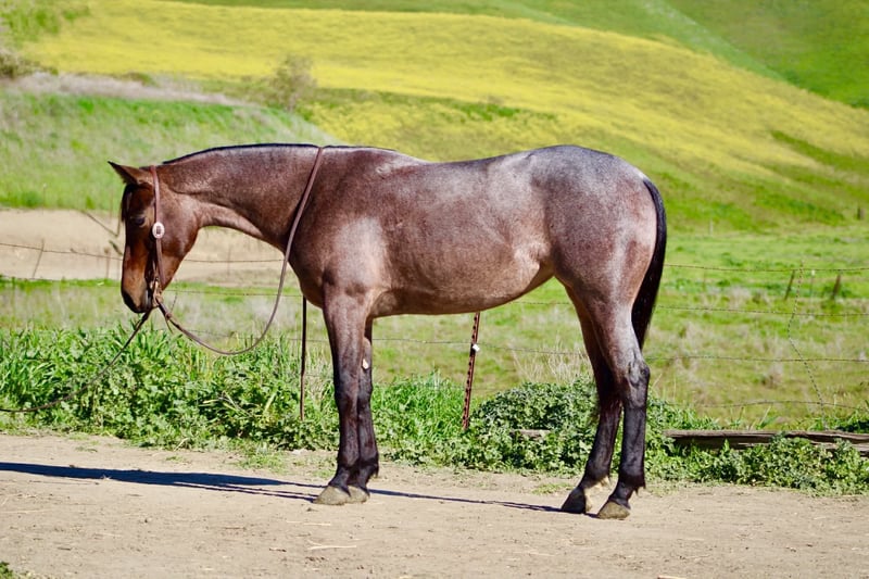 "AVAILABLE ON ONLINE HORSE AUCTION AT www DOT PlatinumEquineAuction DOT com BIDDING OPEN NOW thru SUNDAY | FEBRUARY 22ND! *Final price will be determined on auction site* CONSIGNOR CONTACT INFO: Longhorn Ranch 831-537-1915 LOCATION: Paicines, CA Annie Oakley Roan Mare • 4 Years Old • 15 Hands Annie Oakley is what happens when natural beauty, good training, and a standout mind all land in the same horse. She is talented, genuine, and enjoyable in a way that is immediately apparent — a mare that feels good to sit on, easy to understand, and rewarding to ride. Her rich roan coat, frosted mane and tail, and balanced build make her eye-catching, but her real value shows up when you swing a leg over. For a four-year-old, Annie Oakley is remarkably broke and educated. She rides soft, stays correct through her body, and carries herself with purpose. She bends and shapes willingly, lopes around with a smooth, easy rhythm, and offers a nice sliding stop and a stylish turnaround. She feels steady, confident, and far along for her age. Annie Oakley has a good head on her shoulders. She is gentle, kind, and honest, with a natural desire to do right by her rider. She is safe for a variety of rider levels and adjusts easily to who is in the saddle. She meets you at the gate, drops her head for the bridle, and goes to work with a willing attitude. She is the kind that makes riding simple and enjoyable. She has been tracking cattle, shows a lot of interest, and has already been gathering. Annie Oakley displays plenty of natural cow sense and feels like a mare that will continue to excel with cattle work as she goes forward. She is well exposed and seasoned beyond her years. Bridges, tarps, pool noodles, and obstacle courses are all handled quietly. New places and new tasks are met with curiosity and composure. Out on the trail, Annie Oakley is steady and sure-footed. She travels through hills, crosses water, and handles wildlife and changing scenery with ease. She is just as enjoyable outside the arena as she is inside it. She is good in traffic, stands tied quietly, clips easily, is good for the farrier, hauls well, and does well in both a stall and pasture. Annie Oakley is the kind that earns her keep. The kind that gets ridden first. The kind you build a program around. A truly special young mare with a bright future ahead of her. Longhorn Ranch Paicines, California Dina – 831-537-1915 Shipping is available anywhere we have reputable haulers to help get your new horse safely to your doorstep.