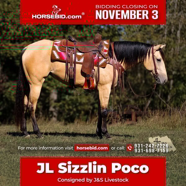 ⚜️𝐓𝐇𝐄 𝐅𝐀𝐋𝐋 𝐇𝐄𝐑𝐈𝐓𝐀𝐆𝐄 𝐂𝐋𝐀𝐒𝐒𝐈𝐂⚜️ Happening now thru MONDAY | NOVEMBER 3rd - Available EXCLUSIVELY on HorseBid's website! For more details and to register visit: www.Horsebid.com CONSIGNOR CONTACT: J&S Livestock Bailey 931-242-7226 or JT 931-698-7159 LOCATION: Santa Fe, TN BREED: Quarter Horse REGISTERED: Yes REGISTERED NAME: JL Sizzlin Poco COLOR: Bucksin HEIGHT: 15.2 AGE: 3 GENDER: Mare JL Sizzlin Poco AKA Sis A stunning, athletic and most of all, brilliant minded 2022 model AQHA buckskin mare, standing 15.2 hands. Sis is truly the definition of kindhearted, willing, intelligent and talented. For just a 3yr old, I promise you will not find a more gentle, and honest young mare her age. This is a horse that has truly been a privilege to ride and most of all makes you want to go out and ride- it truly is such an honor to be around her. She’s as smooth as they come to ride, and as easy to handle as you could want. Sis is a fantastic mover, she has an effortless stop and beautiful lead changes- her lope is like a dream, so easy and slow it feels like you’re floating on a cloud. She’s super soft in the bridle too. Point her wherever you desire and she will not hesitate. On the ground or on her back she is confident, and level headed at all cost. Busy towns, traffic, rivers, creeks, steep inclines, wooded narrow trails, rocky ground, you name it and she will carry you through it, and with no doubt in my mind always taking care of rider. Sis has been trail rode extensively, pushed and checked cattle on our farm, and we have lightly roped calves off her in the pasture. Exposure is something this gal has covered. With her athleticism and quick learning ability (show her once and she will always give it her all from start to finish), Sis would excel great in any type of discipline. She stands great for a bath, trailers well, and is easy to saddle. This mare has a great mind, big heart, and willing attitude. She’s dependable, and will always be the same horse every day. Don’t let her age fool you, with her impeccable manners and quietness, this is a mare we are TRULY proud to offer, and feel confident most anyone with the ability to ride will absolutely love Sis. We would love to talk more about Sis, so give us a call or feel free to text us! She has a current coggins and recent PPE. J.T. 931-698-7159 or Bailey 931-242-7226